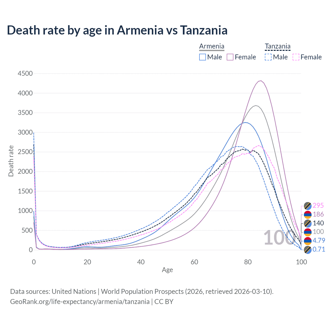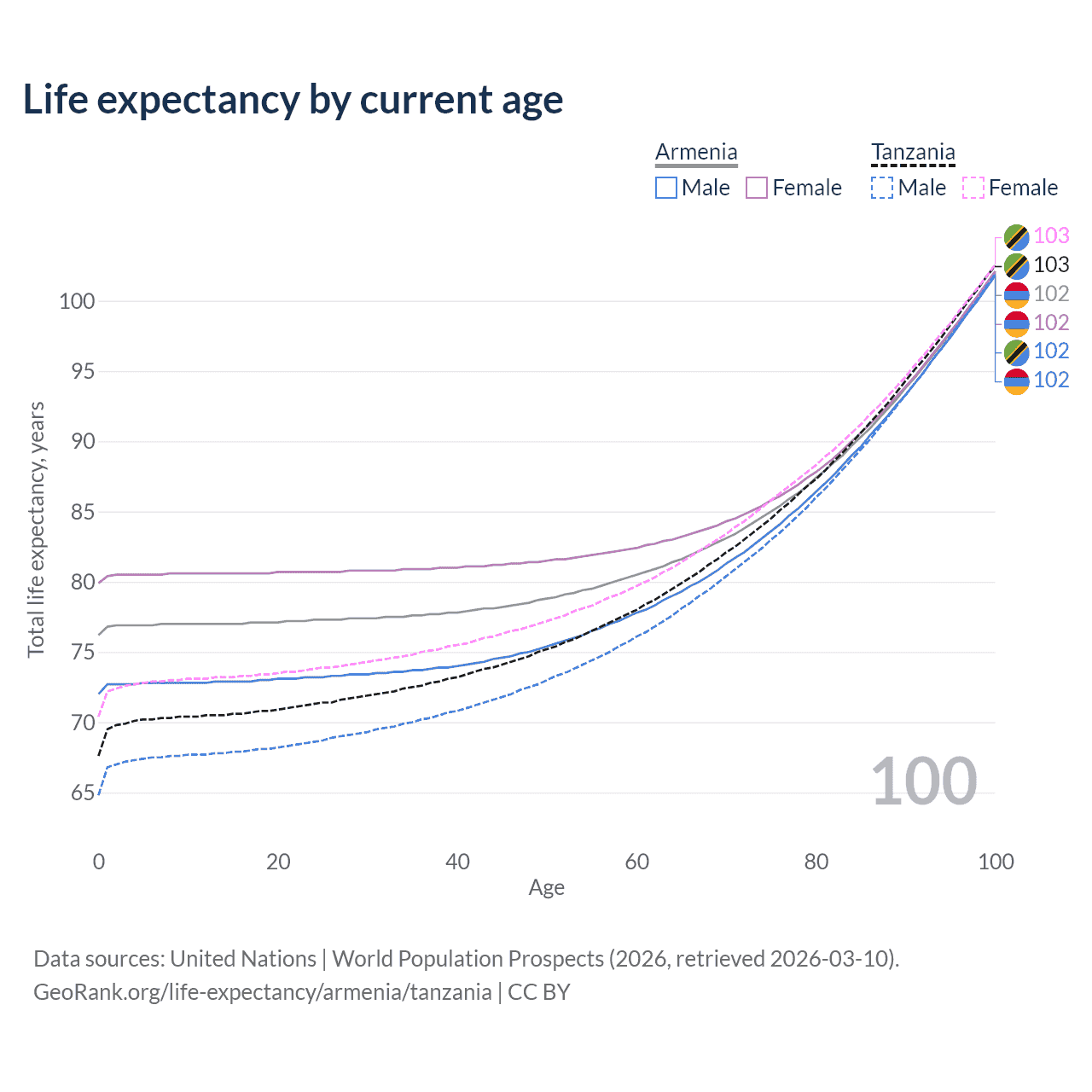 This life expectancy calculator shows the odds of living to 100, 95, 90, and below based on current age for both males and females in Armenia and Tanzania, along with mean and median age of death. The calculations are based on the 2026 life tables (actuarial tables) from the UN World Population Prospects.