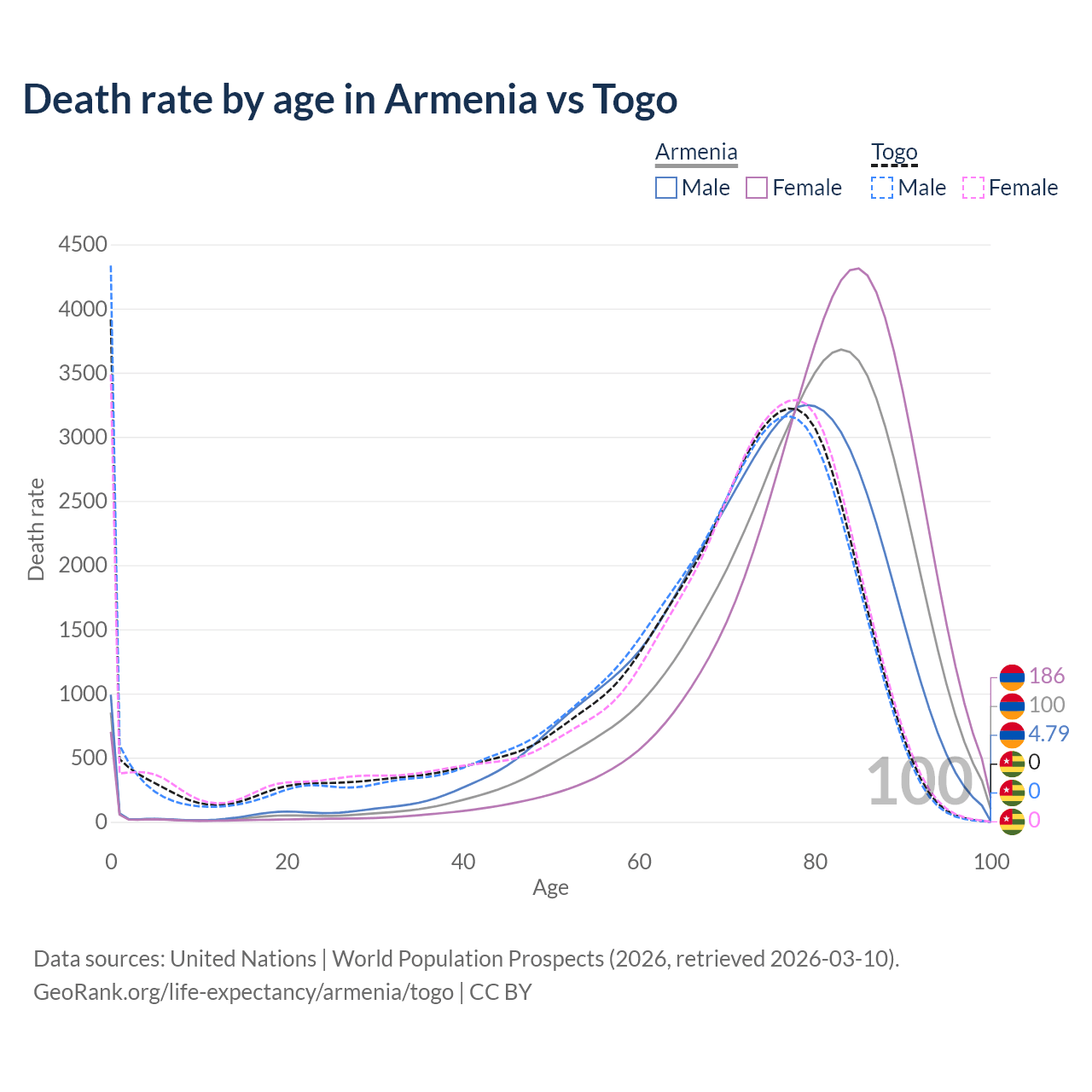 In Armenia, the most common age of death is 83, compared to 0 in Togo. The median age of death is 79.4 in Armenia and 71 in Togo, meaning only half of each cohort is expected to live past that age.