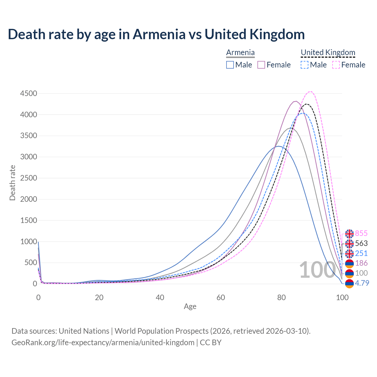 This life expectancy calculator shows the odds of living to 100, 95, 90, and below based on current age for both males and females in Armenia and the United Kingdom, along with mean and median age of death. The calculations are based on the 2026 life tables (actuarial tables) from the UN World Population Prospects.