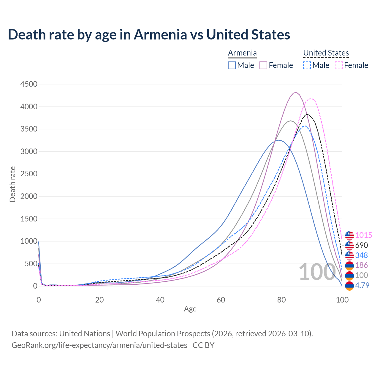 In Armenia, the most common age of death is 83, compared to 89 in the United States. The median age of death is 79.4 in Armenia and 83.9 in the United States, meaning only half of each cohort is expected to live past that age.