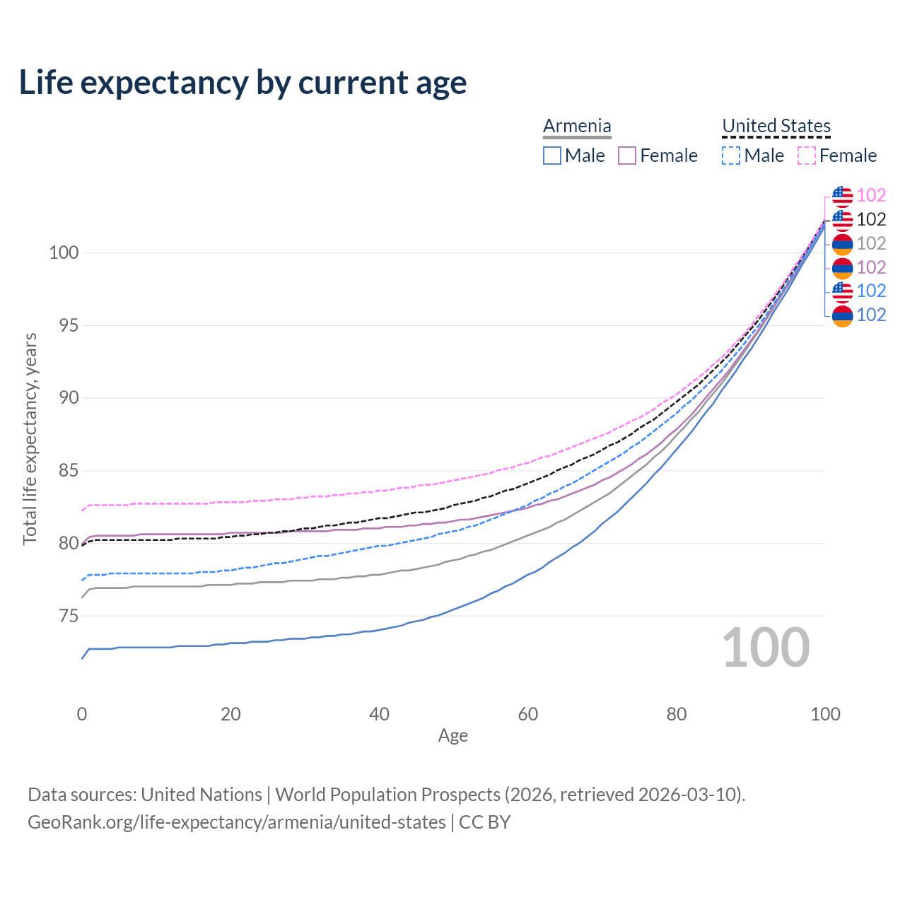 This life expectancy calculator shows the odds of living to 100, 95, 90, and below based on current age for both males and females in Armenia and the United States, along with mean and median age of death. The calculations are based on the 2026 life tables (actuarial tables) from the UN World Population Prospects.