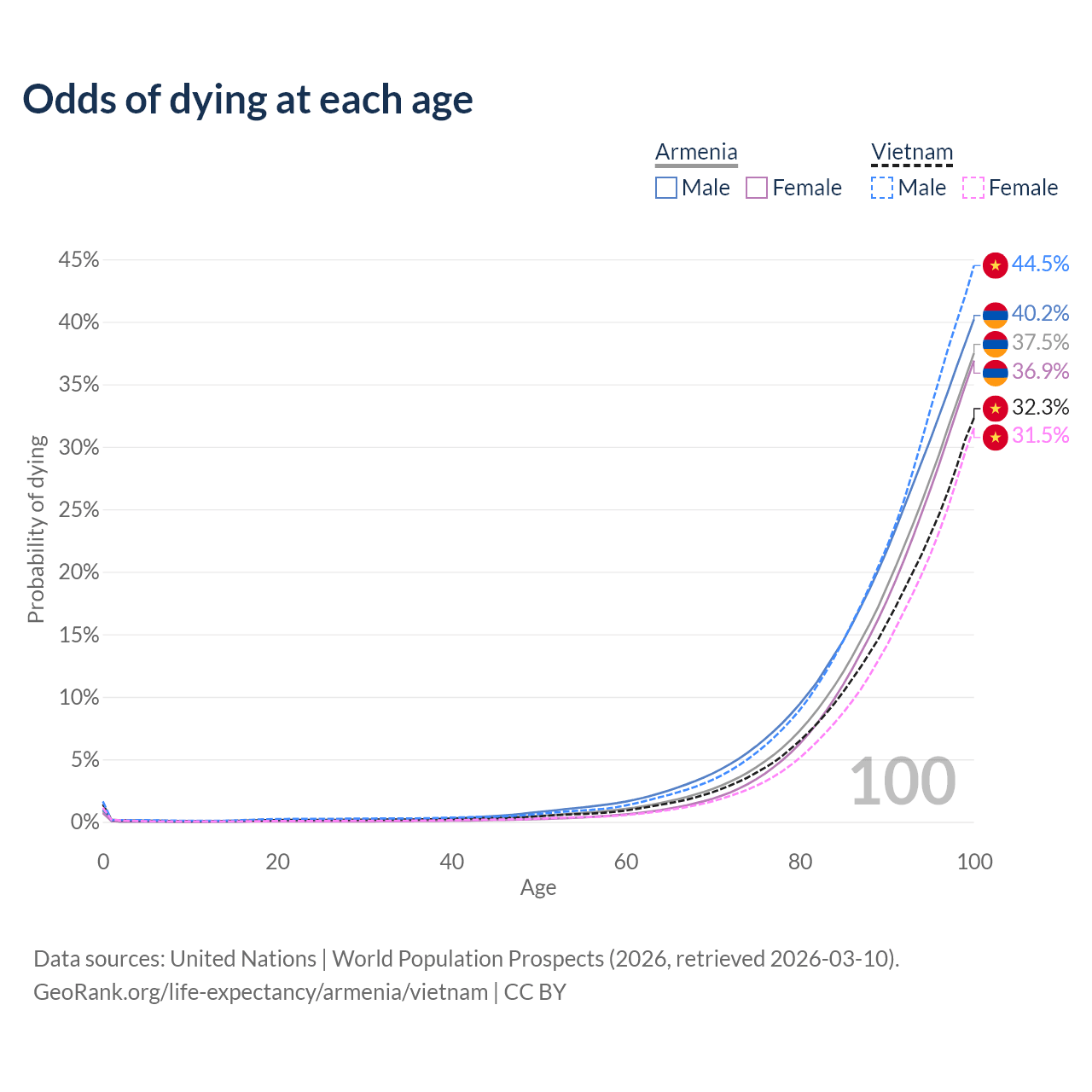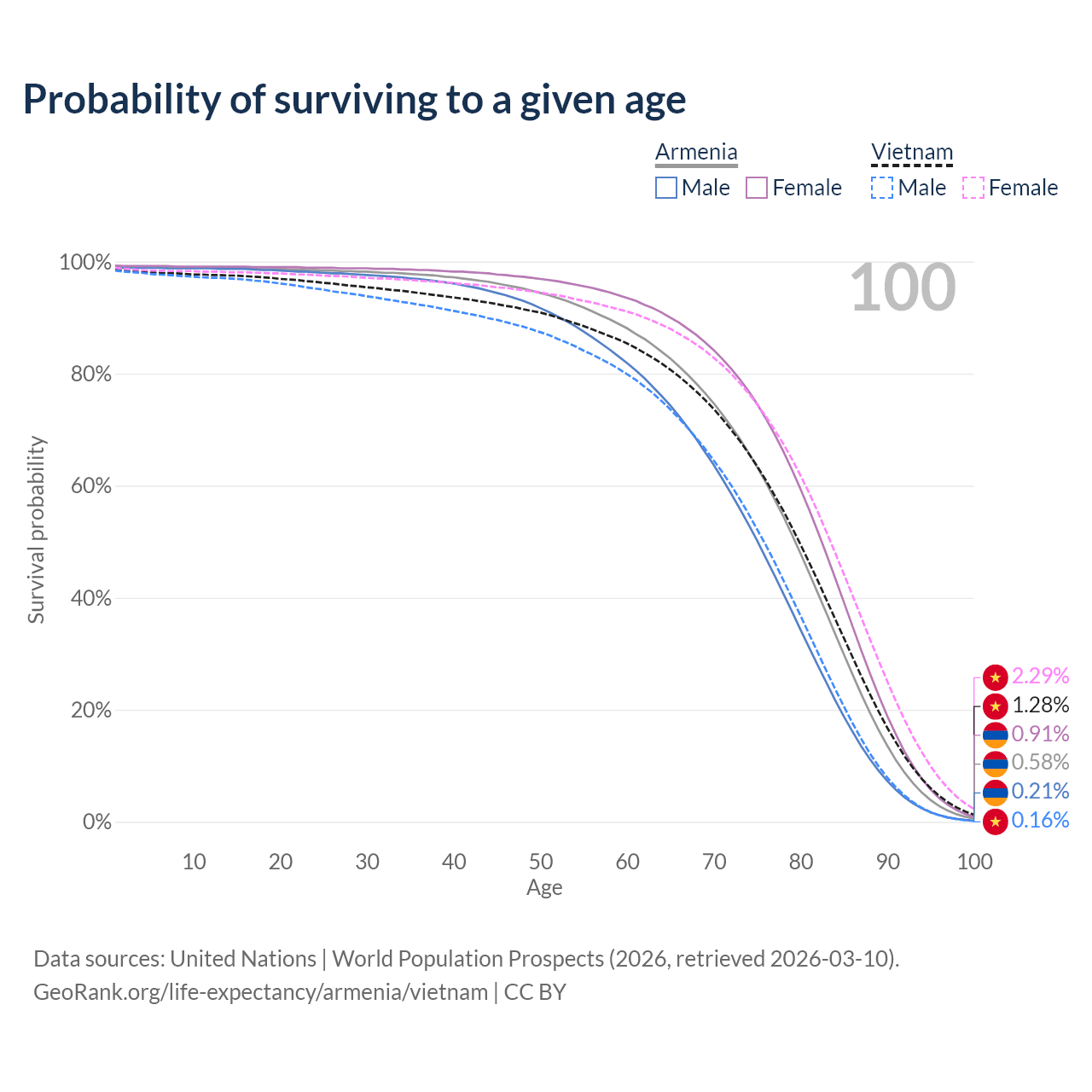 This life expectancy calculator shows the odds of living to 100, 95, 90, and below based on current age for both males and females in Armenia and Vietnam, along with mean and median age of death. The calculations are based on the 2026 life tables (actuarial tables) from the UN World Population Prospects.