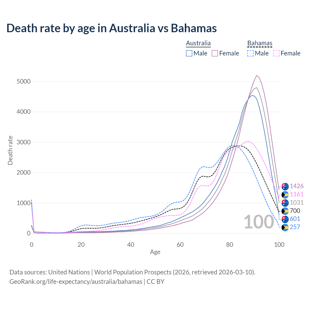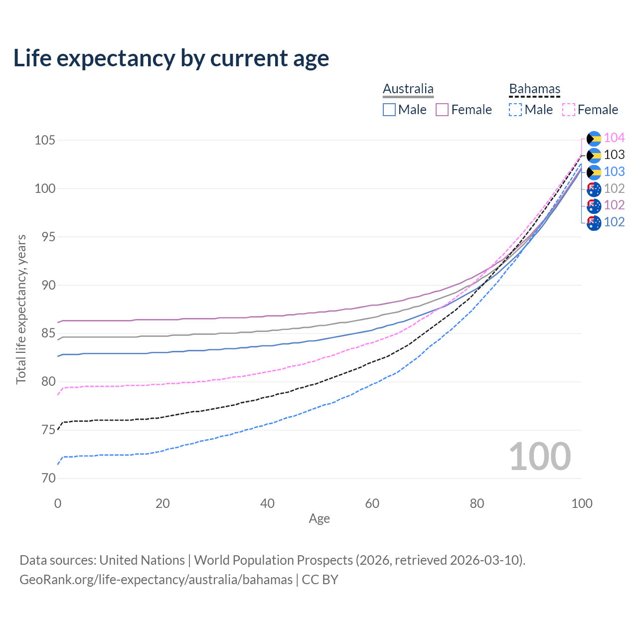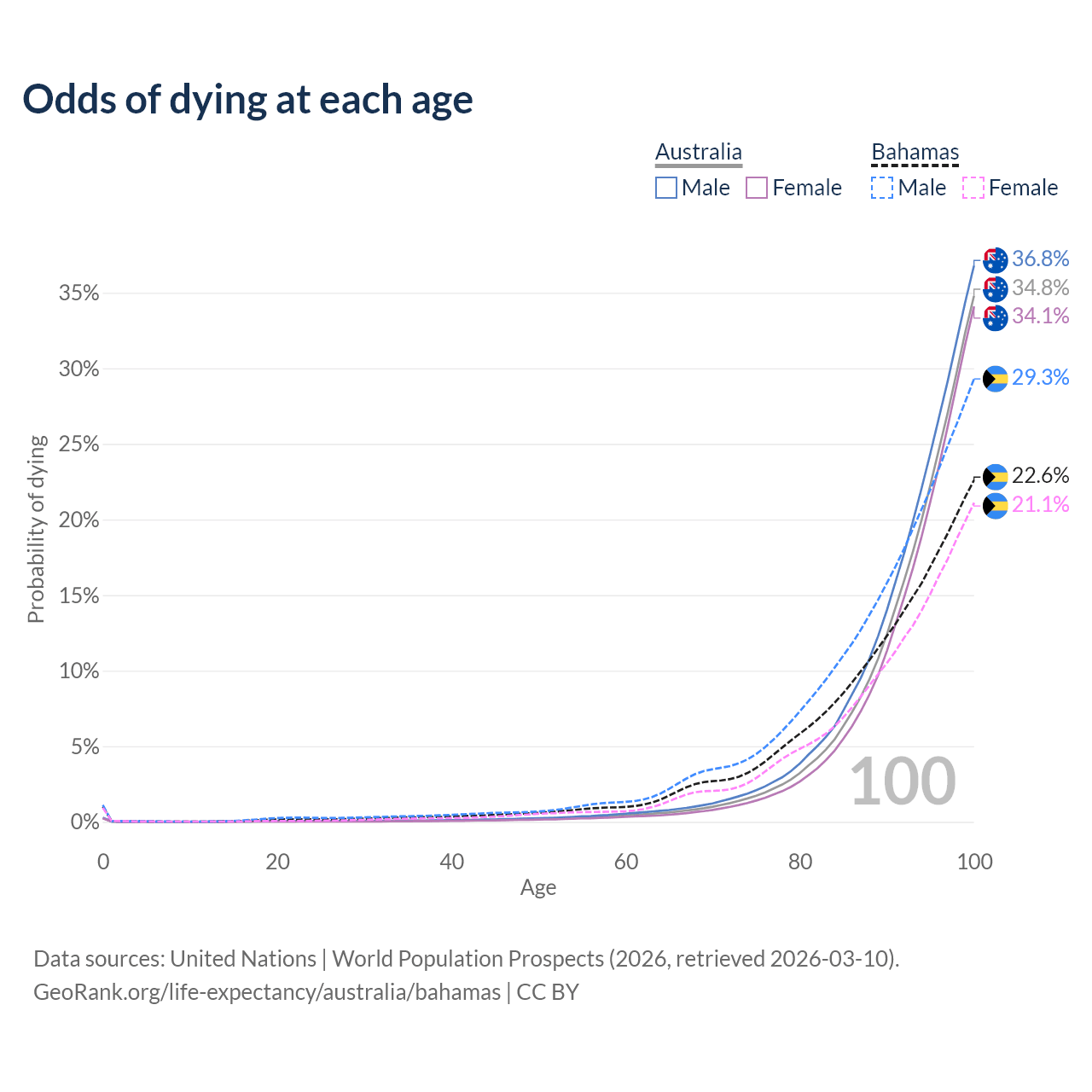 This life expectancy calculator shows the odds of living to 100, 95, 90, and below based on current age for both males and females in Australia and the Bahamas, along with mean and median age of death. The calculations are based on the 2026 life tables (actuarial tables) from the UN World Population Prospects.