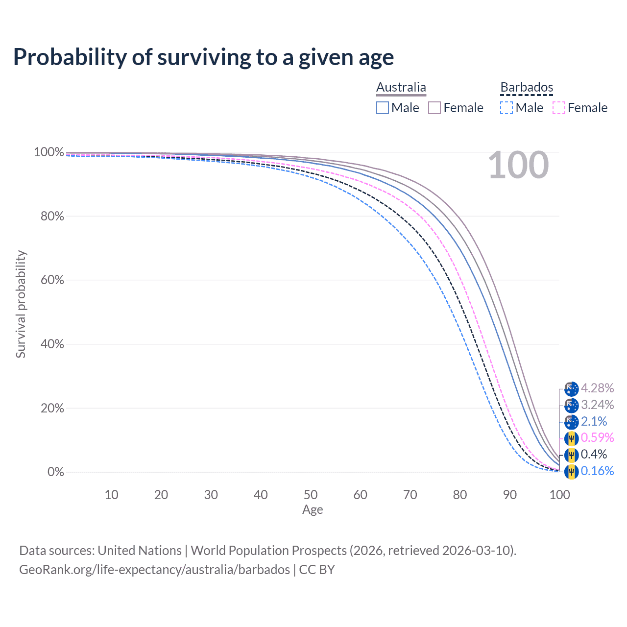 This life expectancy calculator shows the odds of living to 100, 95, 90, and below based on current age for both males and females in Australia and Barbados, along with mean and median age of death. The calculations are based on the 2026 life tables (actuarial tables) from the UN World Population Prospects.