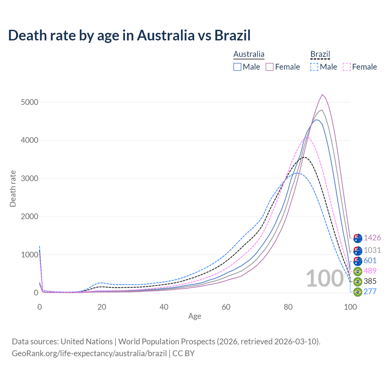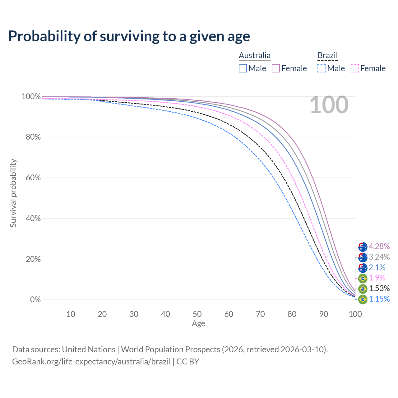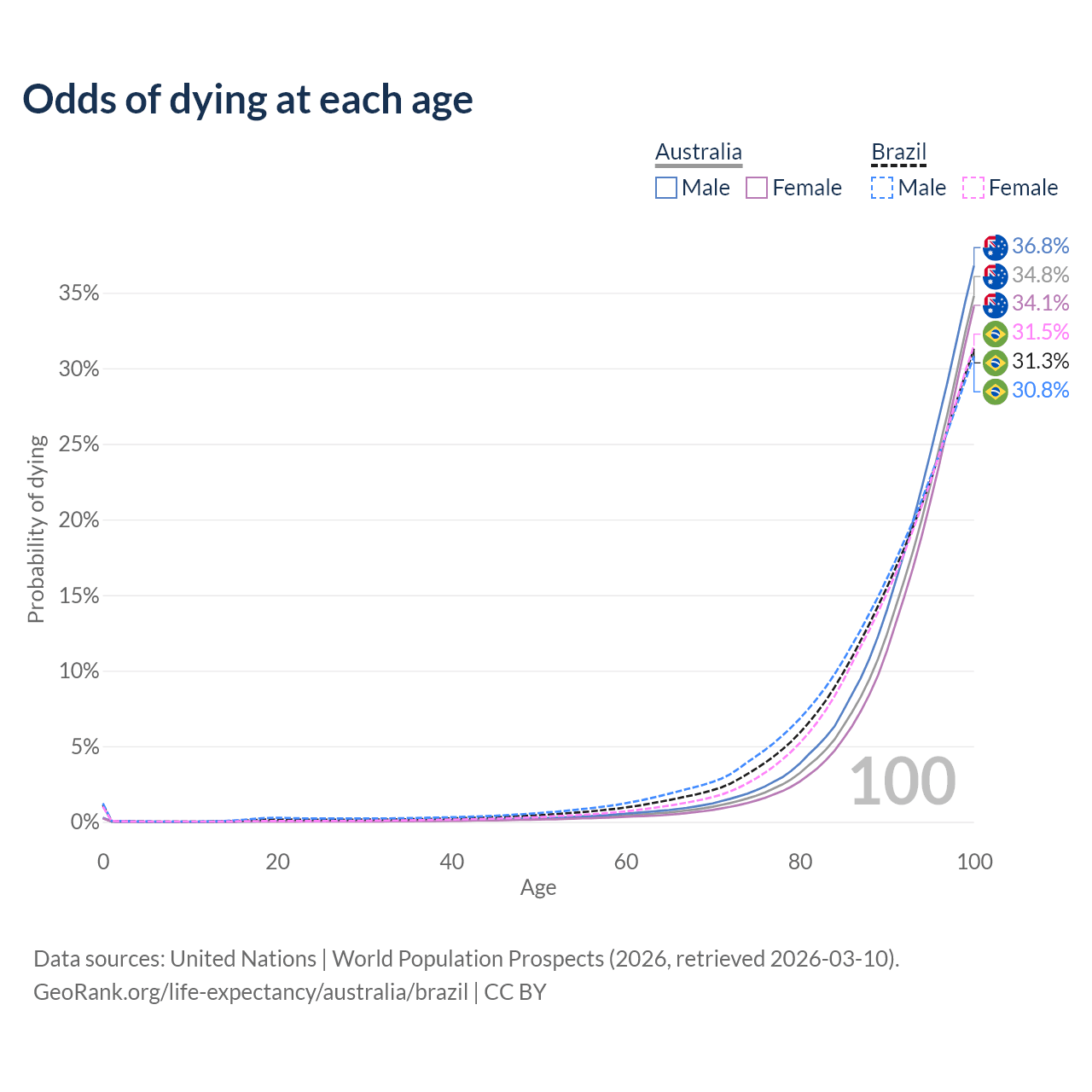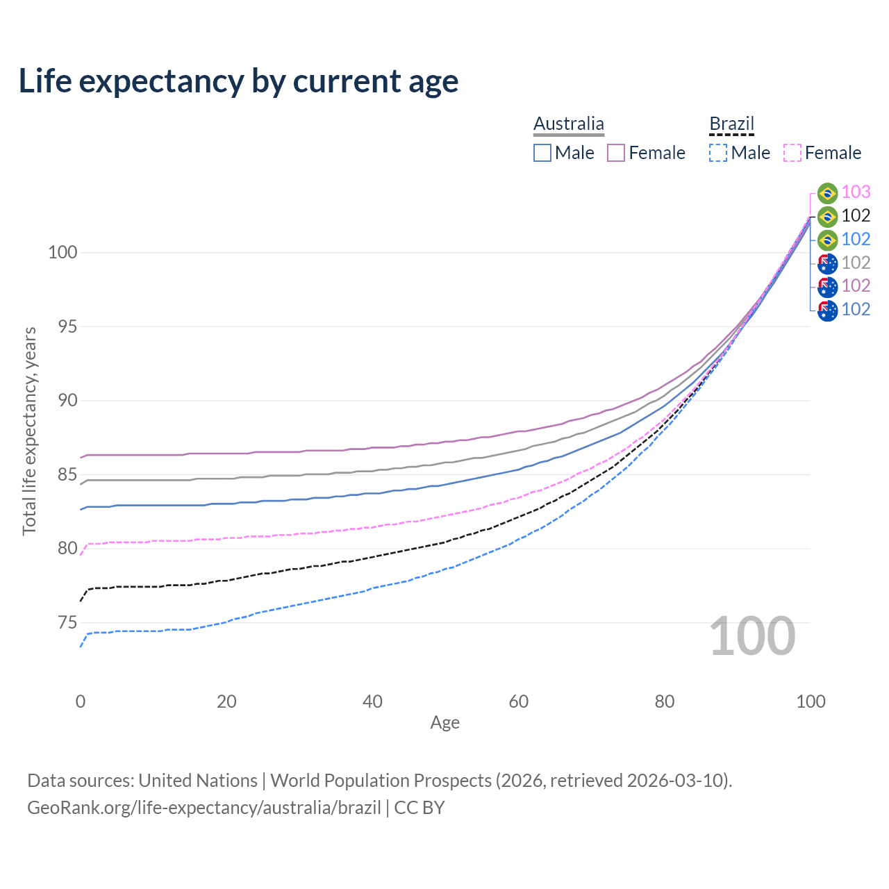 This life expectancy calculator shows the odds of living to 100, 95, 90, and below based on current age for both males and females in Australia and Brazil, along with mean and median age of death. The calculations are based on the 2026 life tables (actuarial tables) from the UN World Population Prospects.