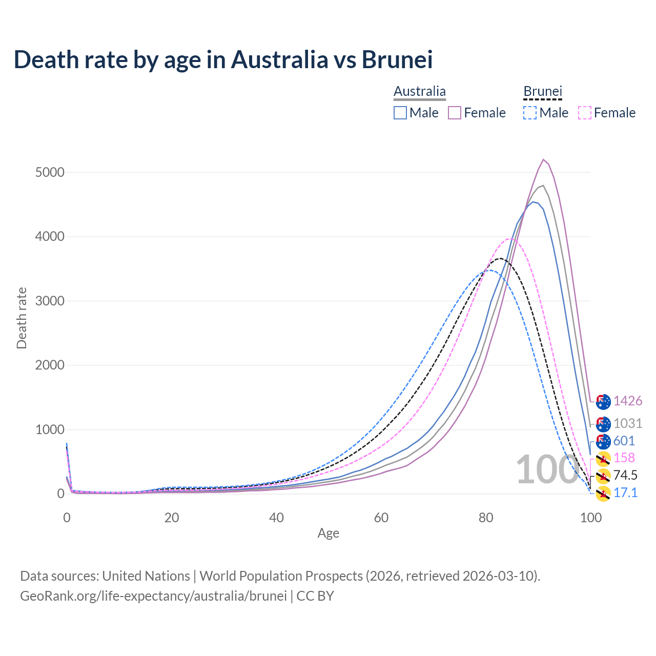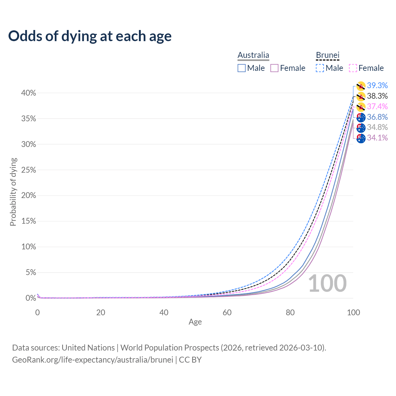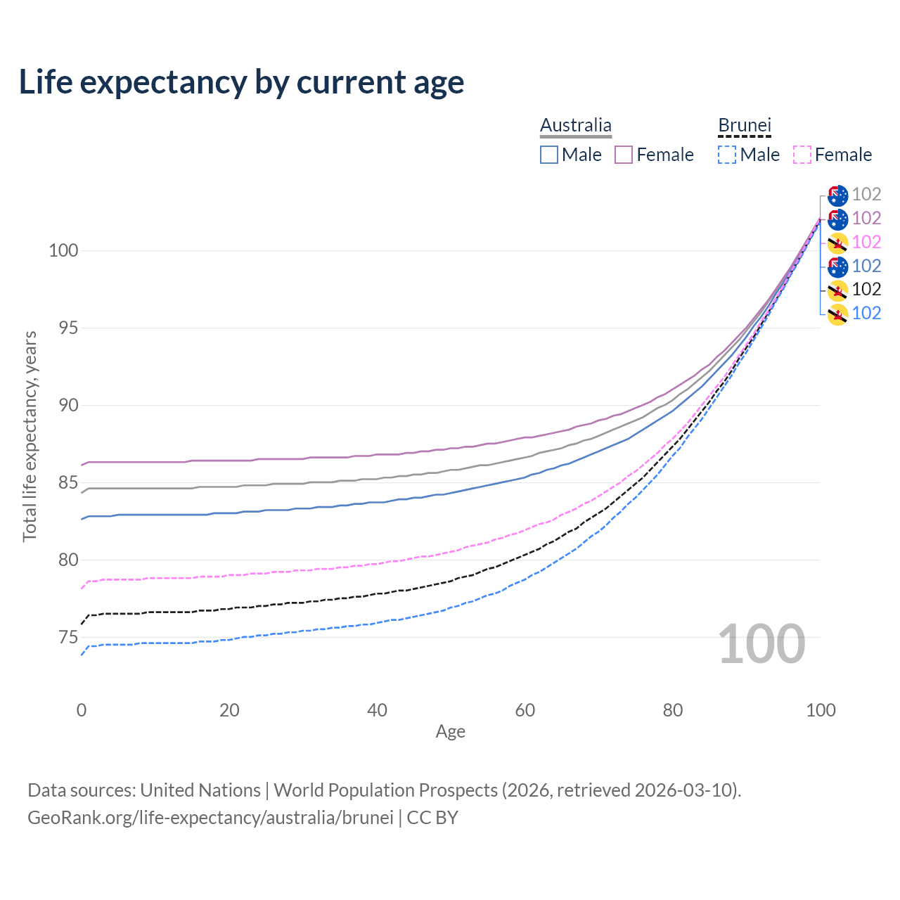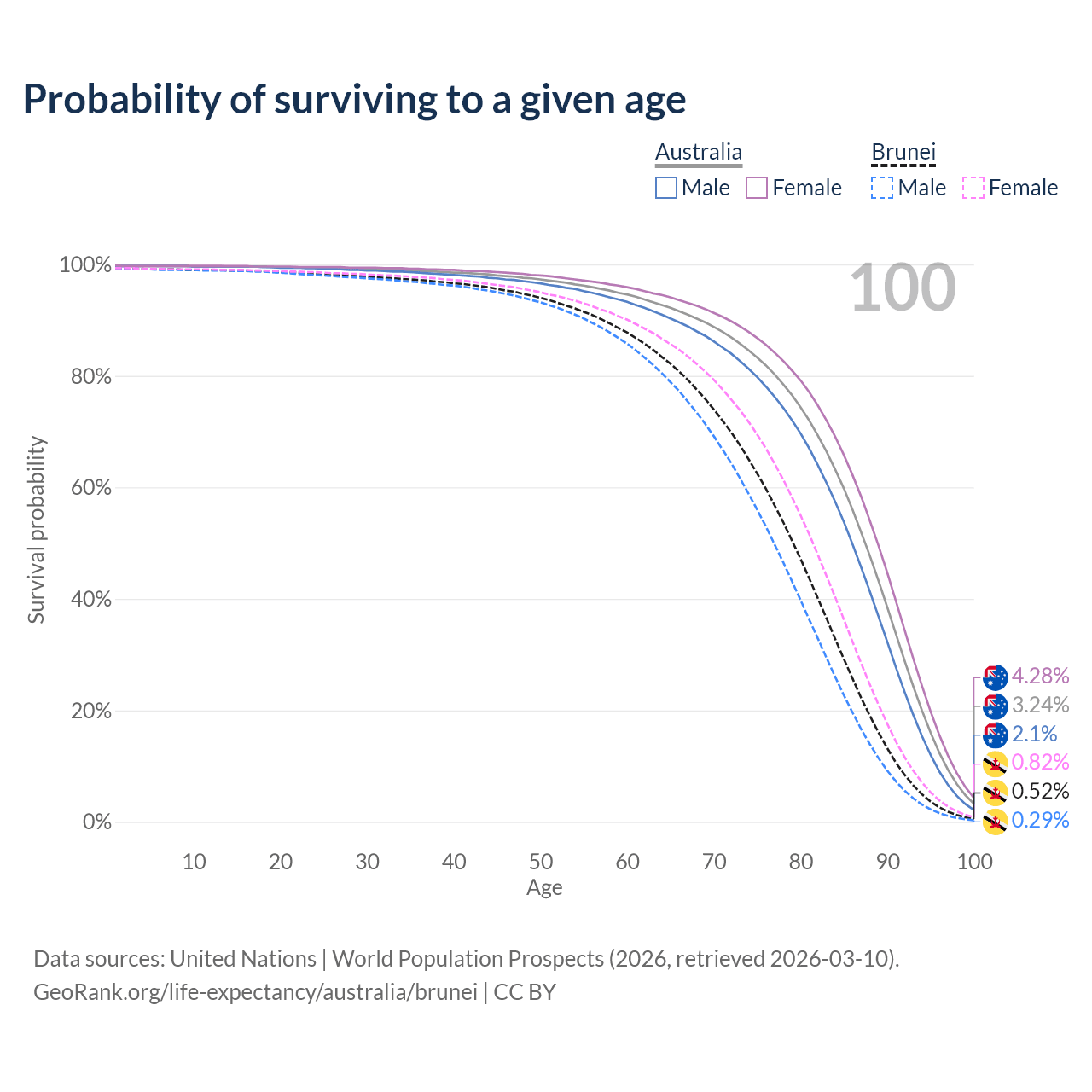 This life expectancy calculator shows the odds of living to 100, 95, 90, and below based on current age for both males and females in Australia and Brunei, along with mean and median age of death. The calculations are based on the 2026 life tables (actuarial tables) from the UN World Population Prospects.
