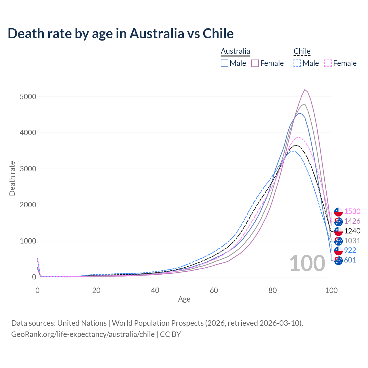 In Australia, the most common age of death is 91, compared to 88 in Chile. The median age of death is 87.5 in Australia and 84.8 in Chile, meaning only half of each cohort is expected to live past that age.
