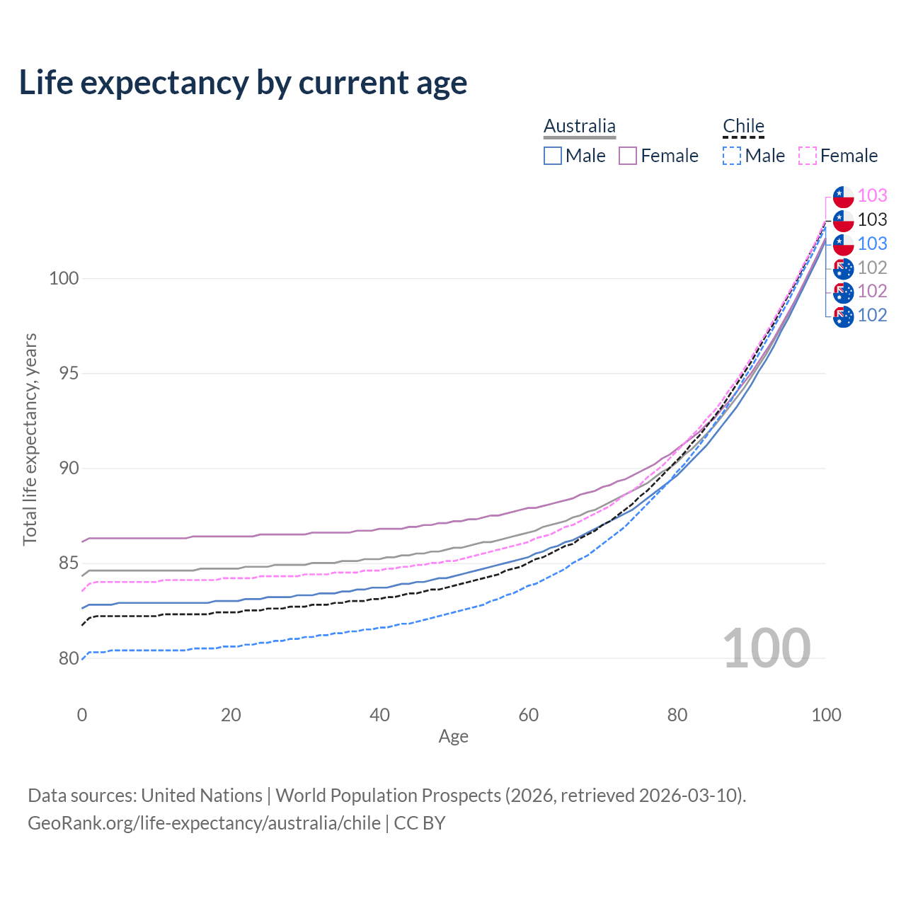 This life expectancy calculator shows the odds of living to 100, 95, 90, and below based on current age for both males and females in Australia and Chile, along with mean and median age of death. The calculations are based on the 2026 life tables (actuarial tables) from the UN World Population Prospects.