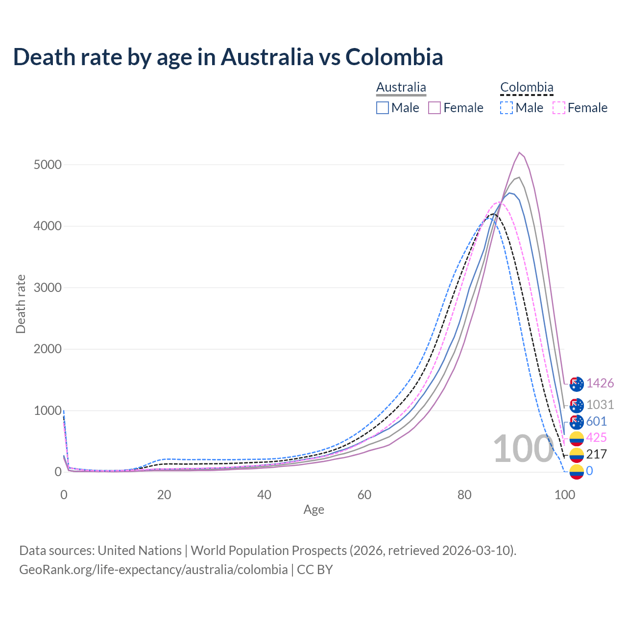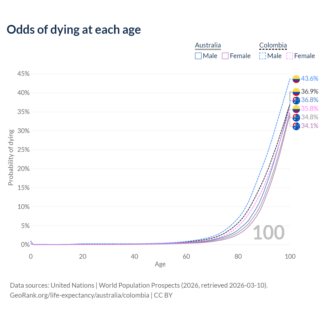 This life expectancy calculator shows the odds of living to 100, 95, 90, and below based on current age for both males and females in Australia and Colombia, along with mean and median age of death. The calculations are based on the 2026 life tables (actuarial tables) from the UN World Population Prospects.