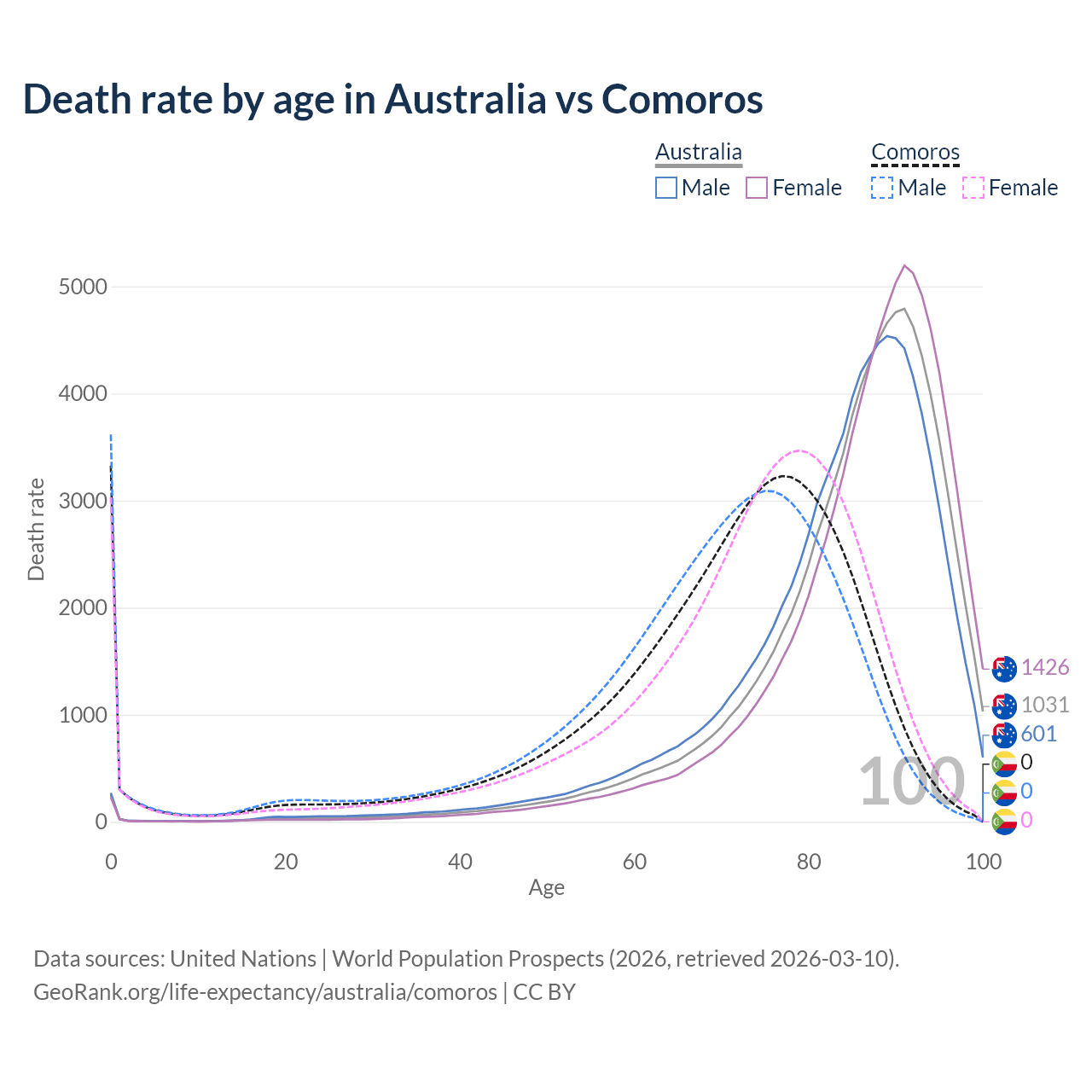 In Australia, the most common age of death is 91, compared to 0 in Comoros. The median age of death is 87.5 in Australia and 72.9 in Comoros, meaning only half of each cohort is expected to live past that age.