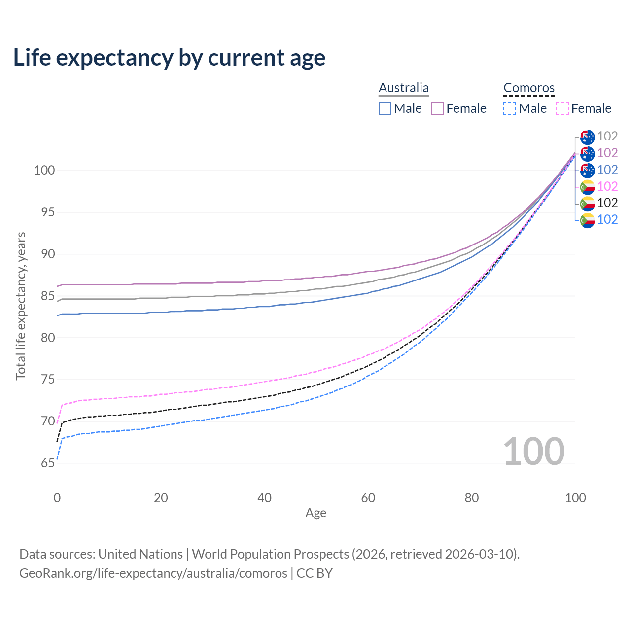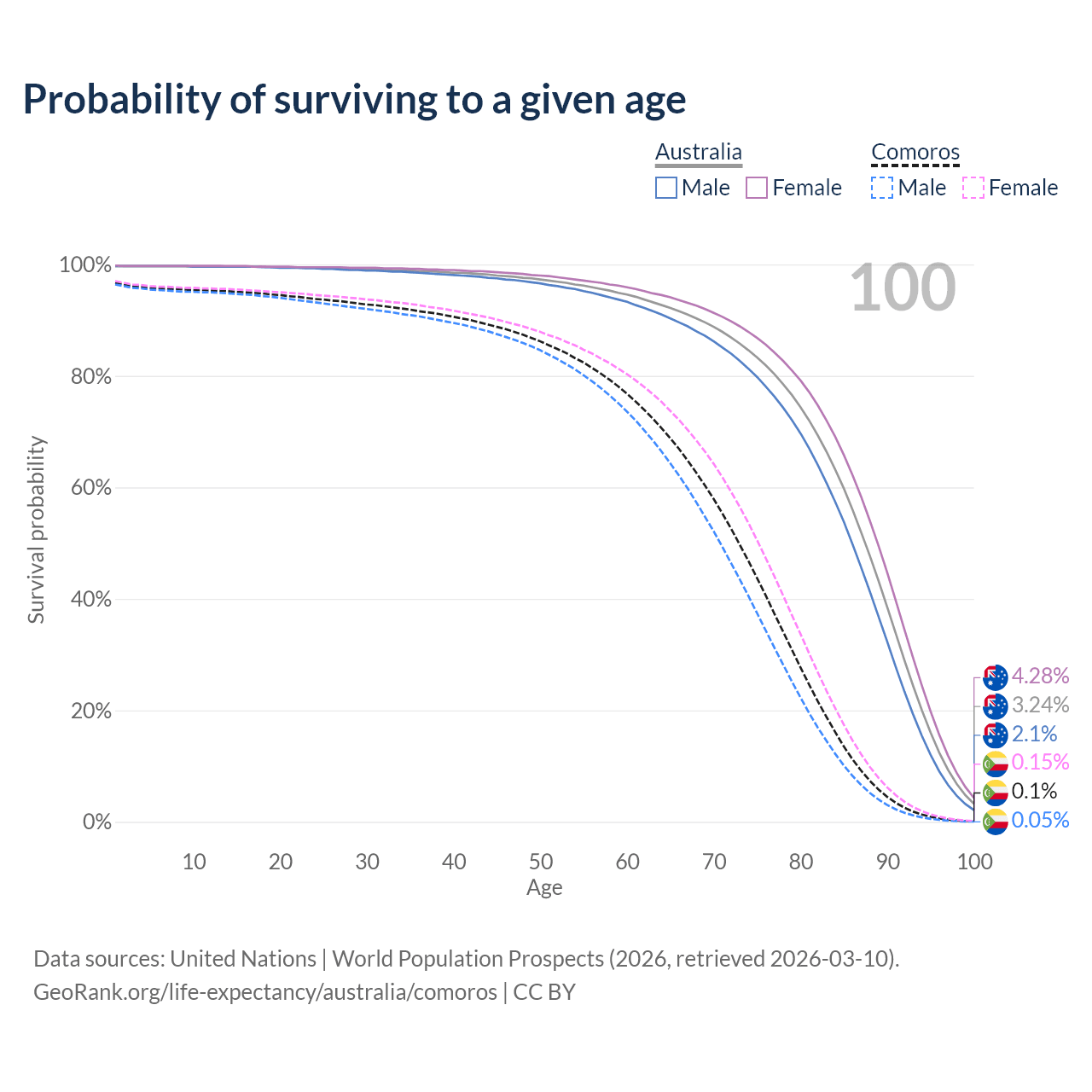 This life expectancy calculator shows the odds of living to 100, 95, 90, and below based on current age for both males and females in Australia and Comoros, along with mean and median age of death. The calculations are based on the 2026 life tables (actuarial tables) from the UN World Population Prospects.