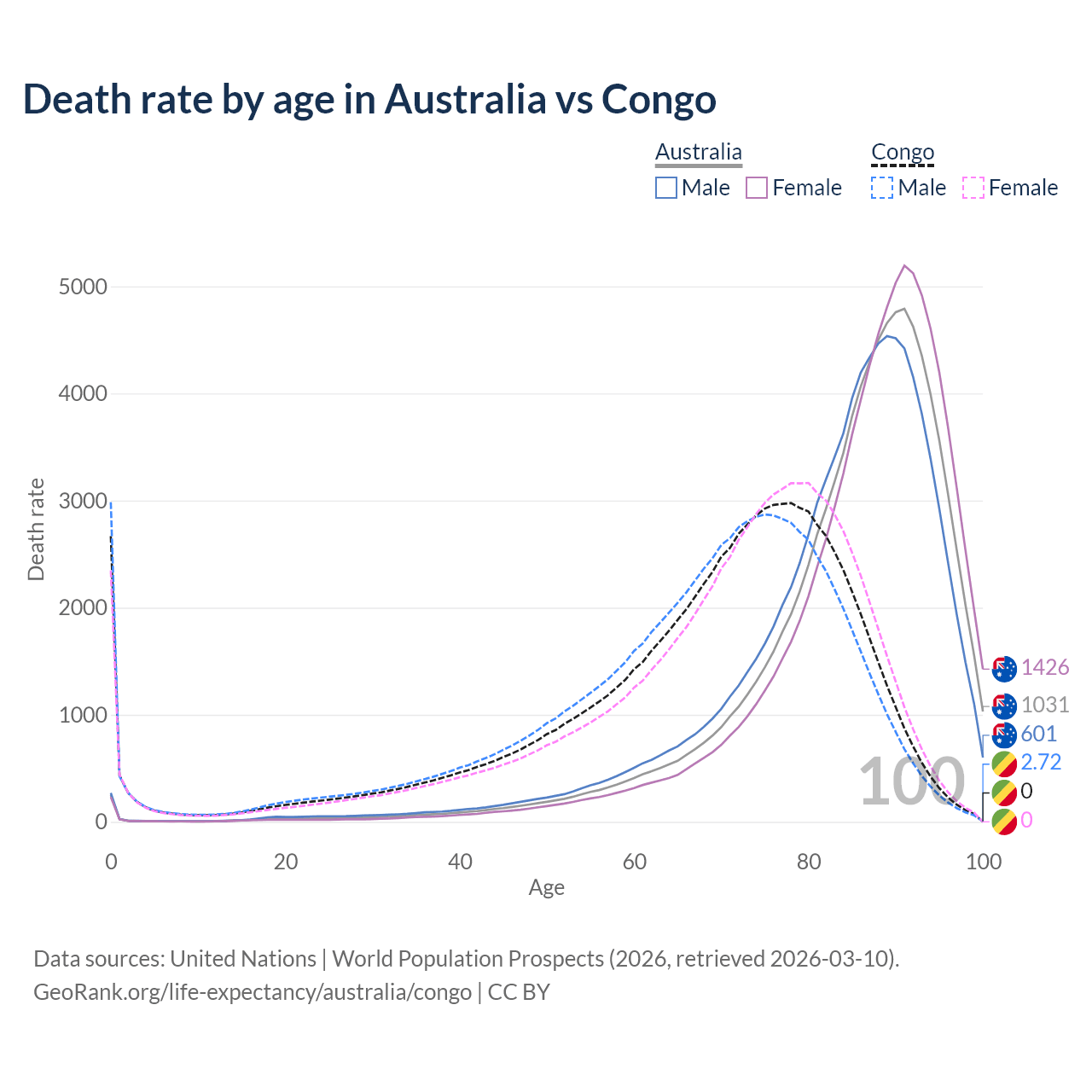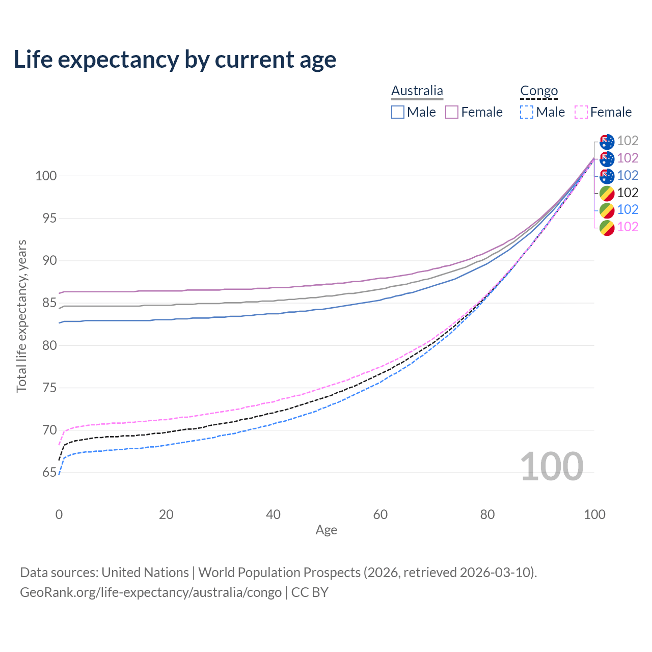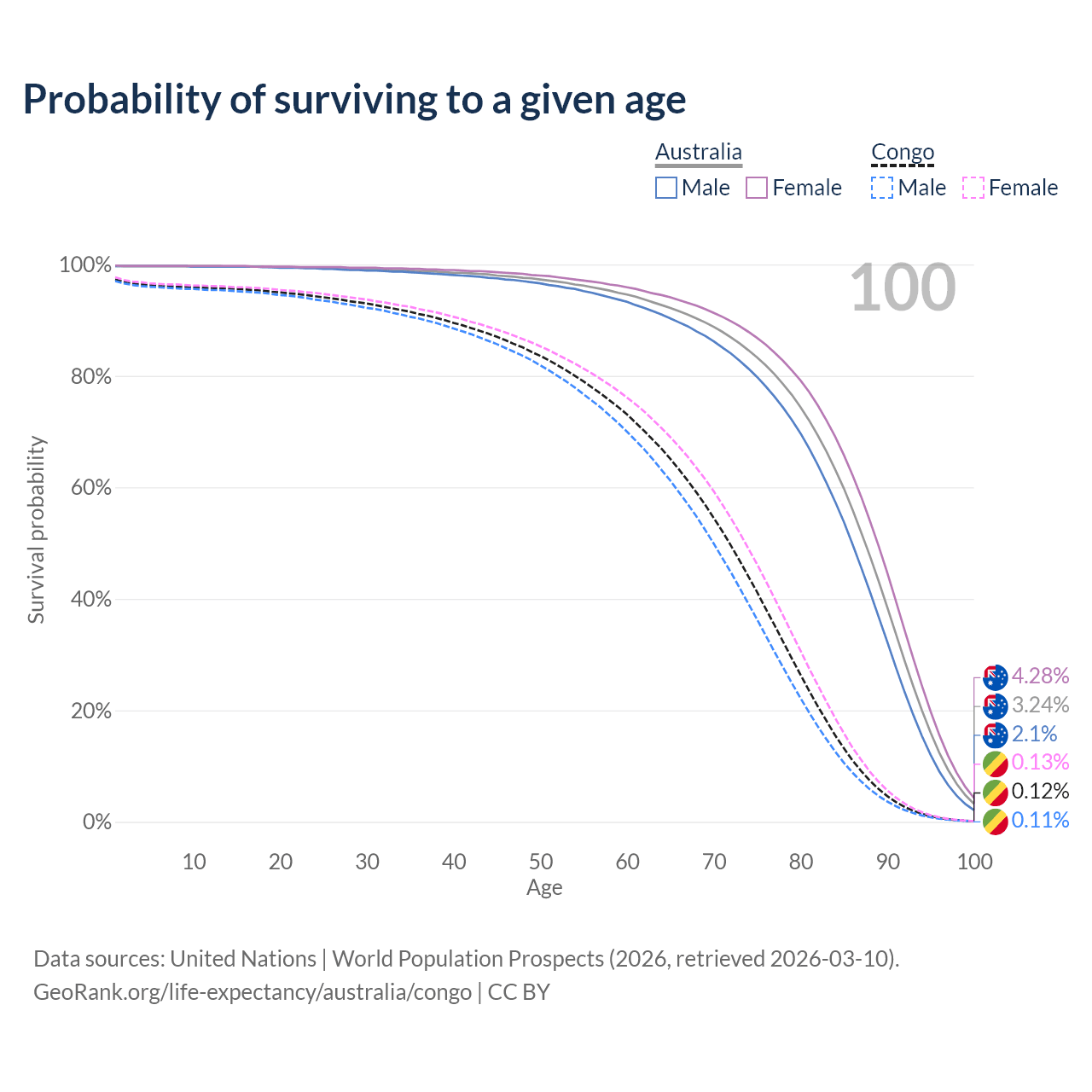 This life expectancy calculator shows the odds of living to 100, 95, 90, and below based on current age for both males and females in Australia and the Congo, along with mean and median age of death. The calculations are based on the 2026 life tables (actuarial tables) from the UN World Population Prospects.