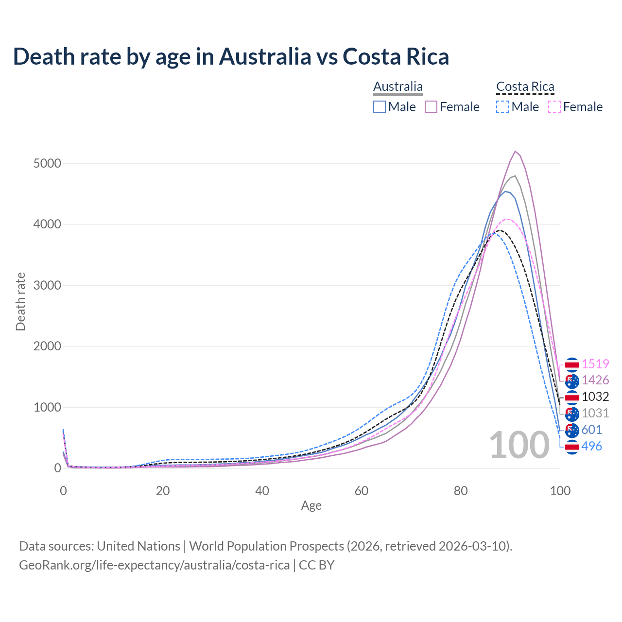 In Australia, the most common age of death is 91, compared to 88 in Costa Rica. The median age of death is 87.5 in Australia and 85 in Costa Rica, meaning only half of each cohort is expected to live past that age.