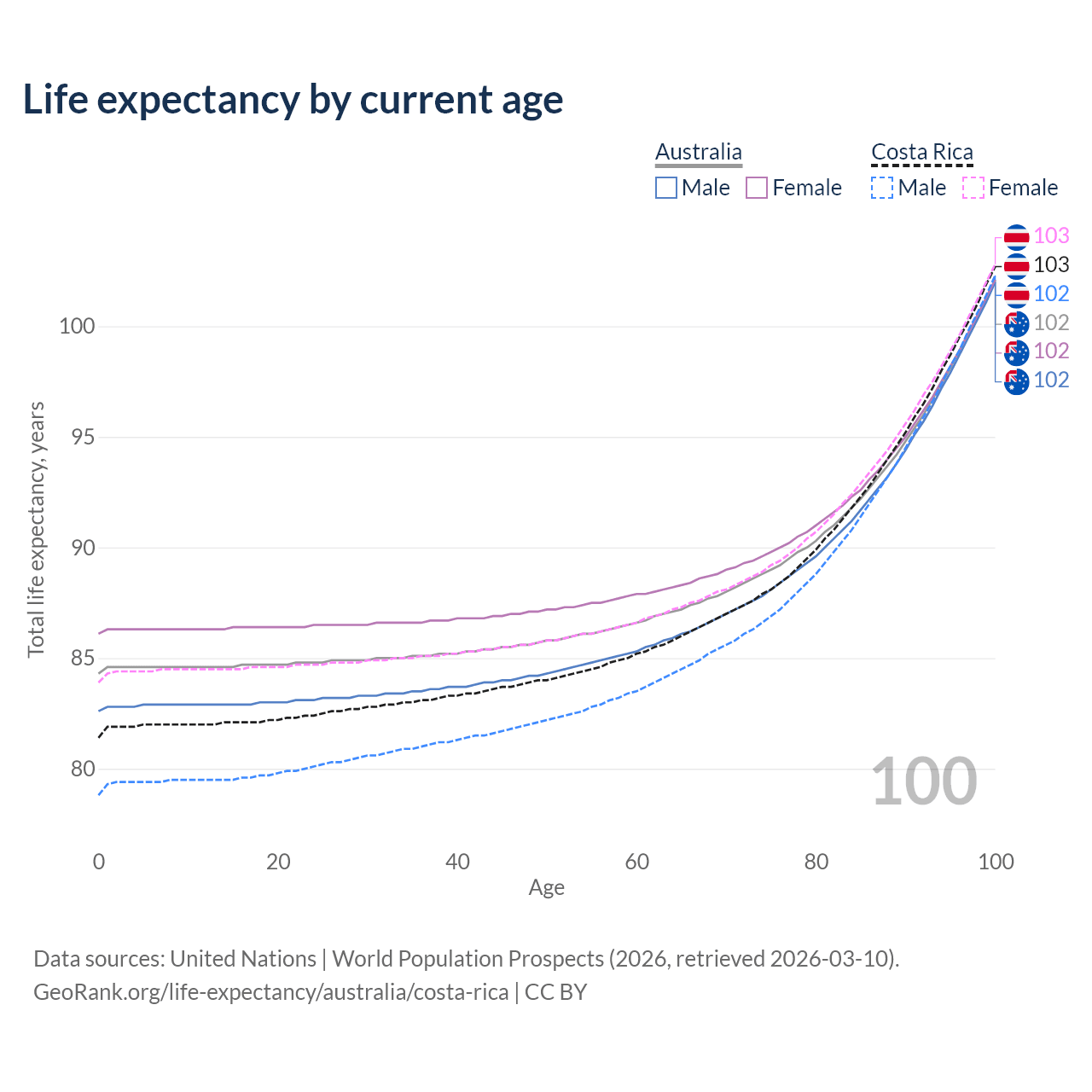 This life expectancy calculator shows the odds of living to 100, 95, 90, and below based on current age for both males and females in Australia and Costa Rica, along with mean and median age of death. The calculations are based on the 2026 life tables (actuarial tables) from the UN World Population Prospects.