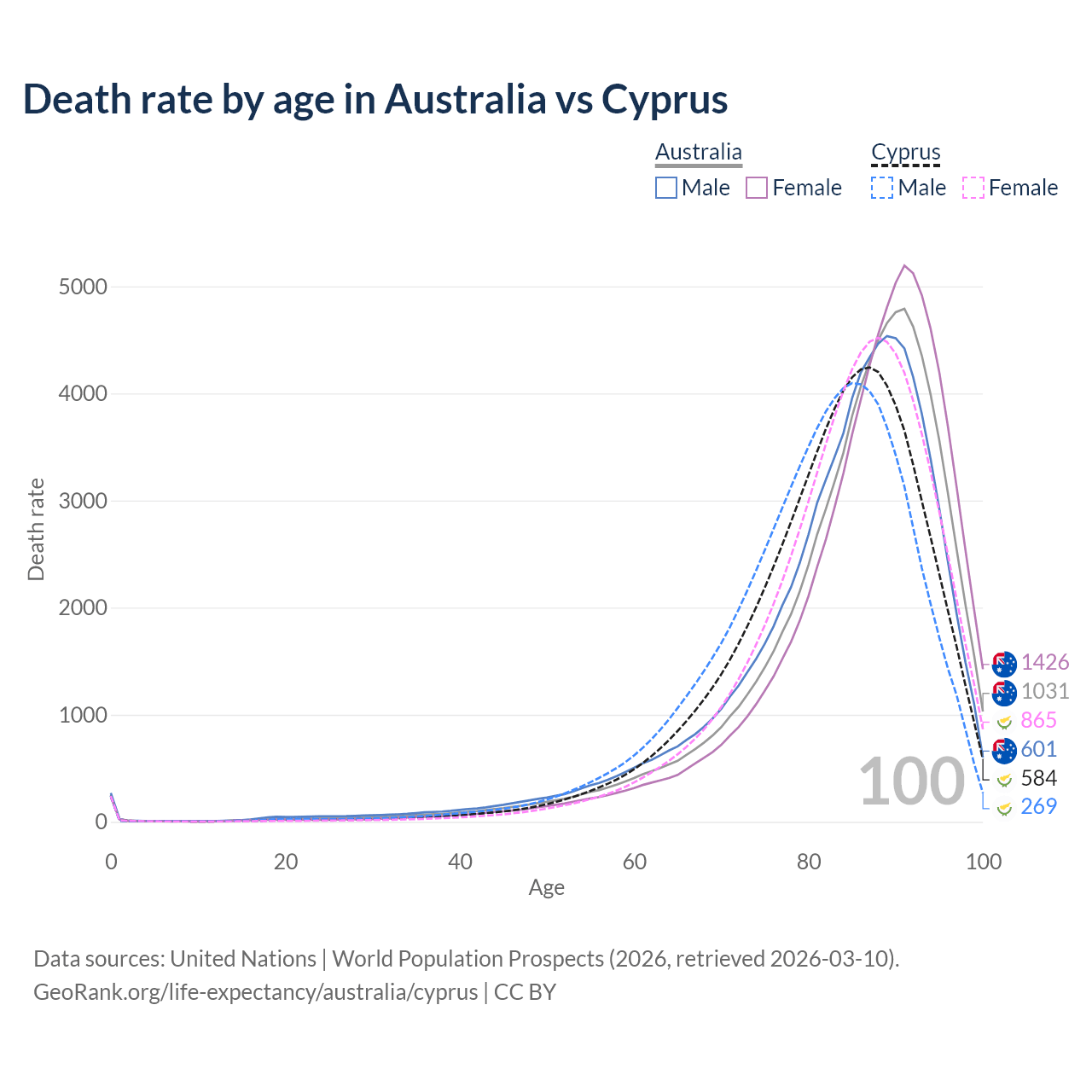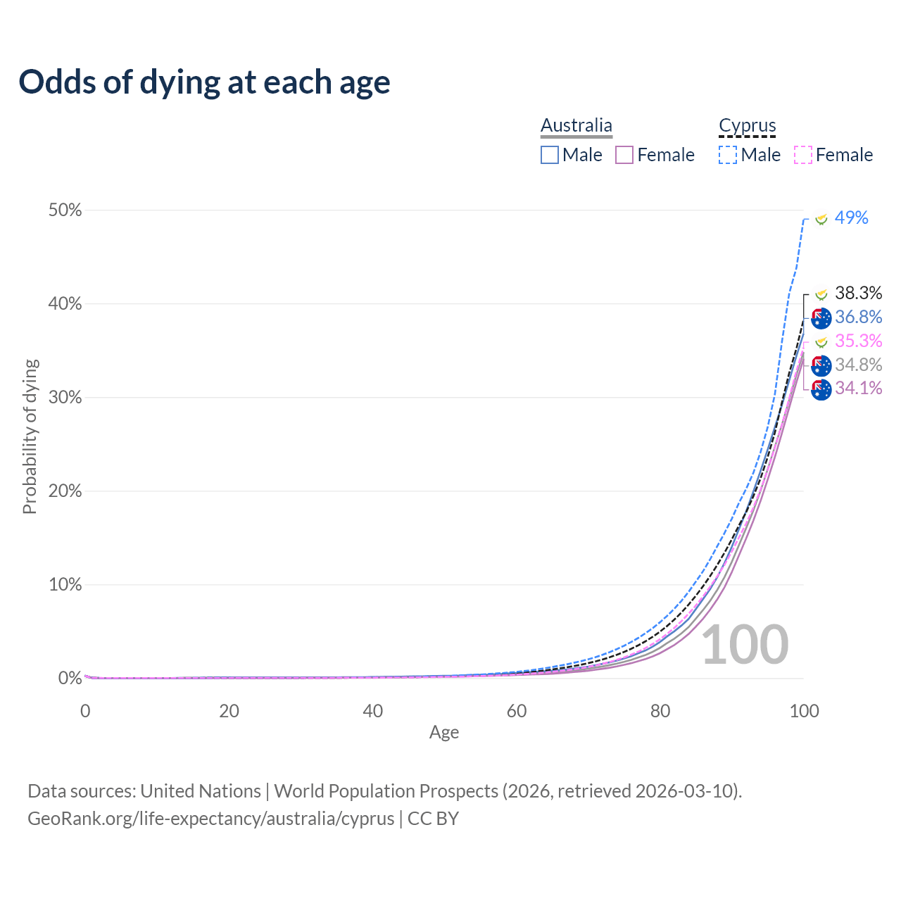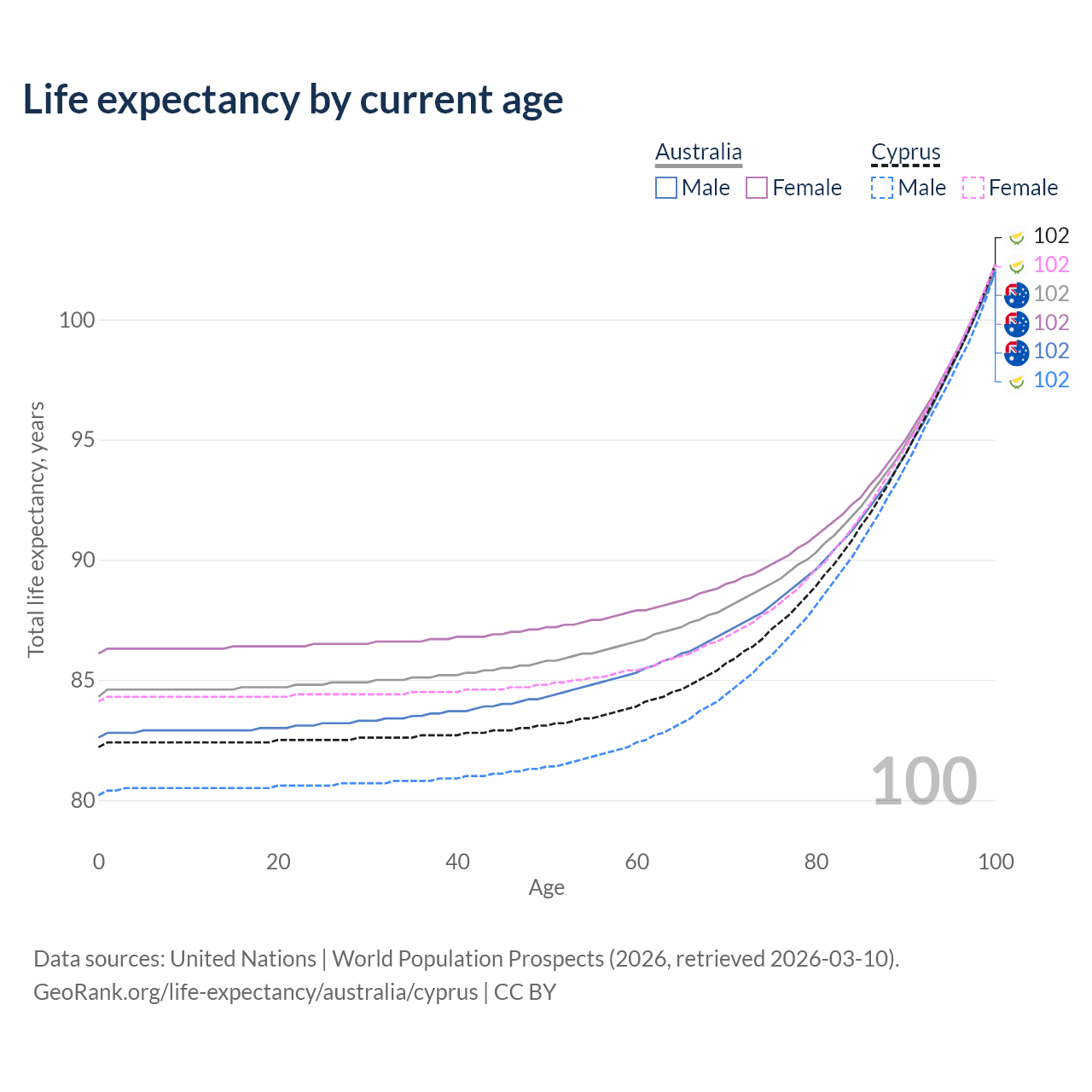 This life expectancy calculator shows the odds of living to 100, 95, 90, and below based on current age for both males and females in Australia and Cyprus, along with mean and median age of death. The calculations are based on the 2026 life tables (actuarial tables) from the UN World Population Prospects.