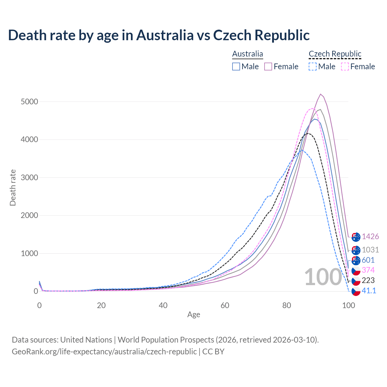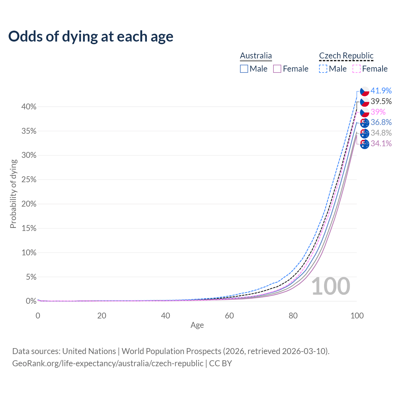 This life expectancy calculator shows the odds of living to 100, 95, 90, and below based on current age for both males and females in Australia and the Czech Republic, along with mean and median age of death. The calculations are based on the 2026 life tables (actuarial tables) from the UN World Population Prospects.