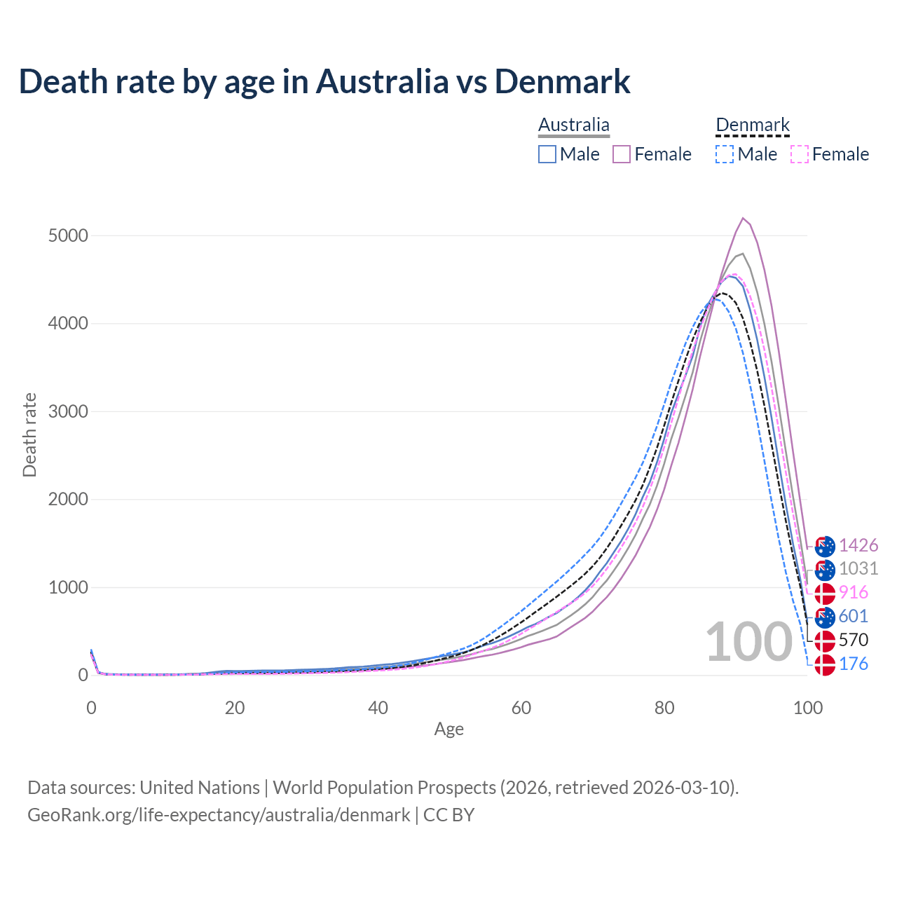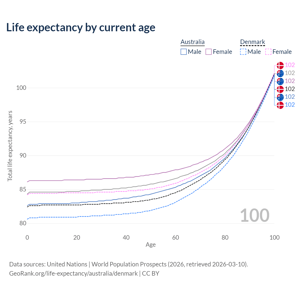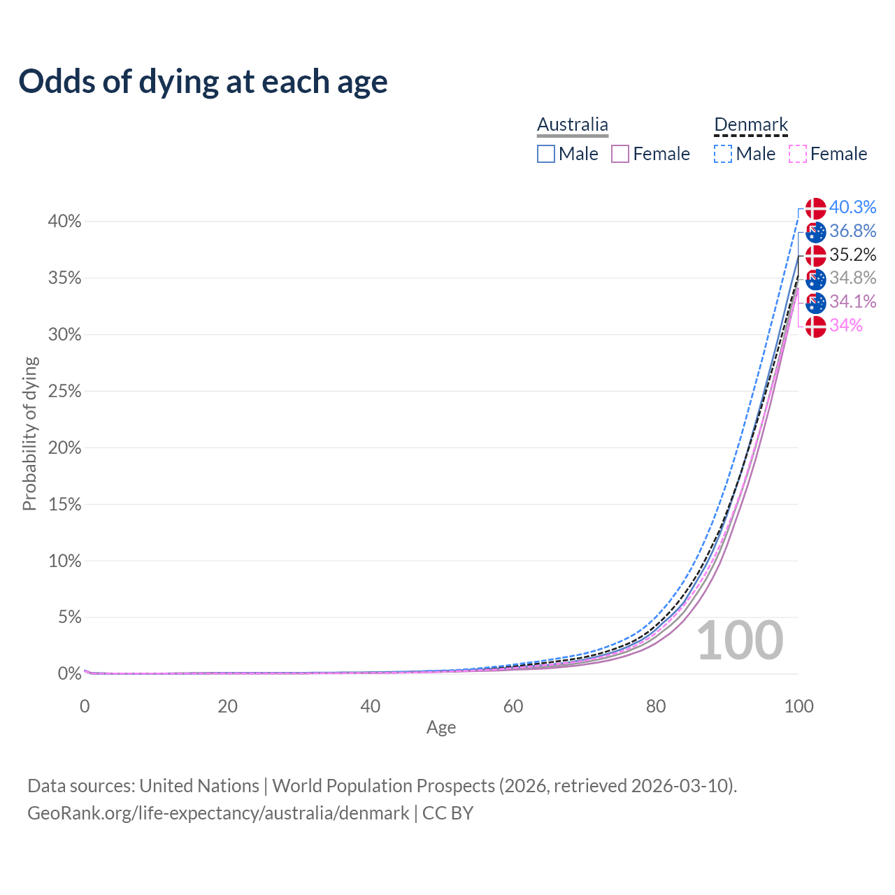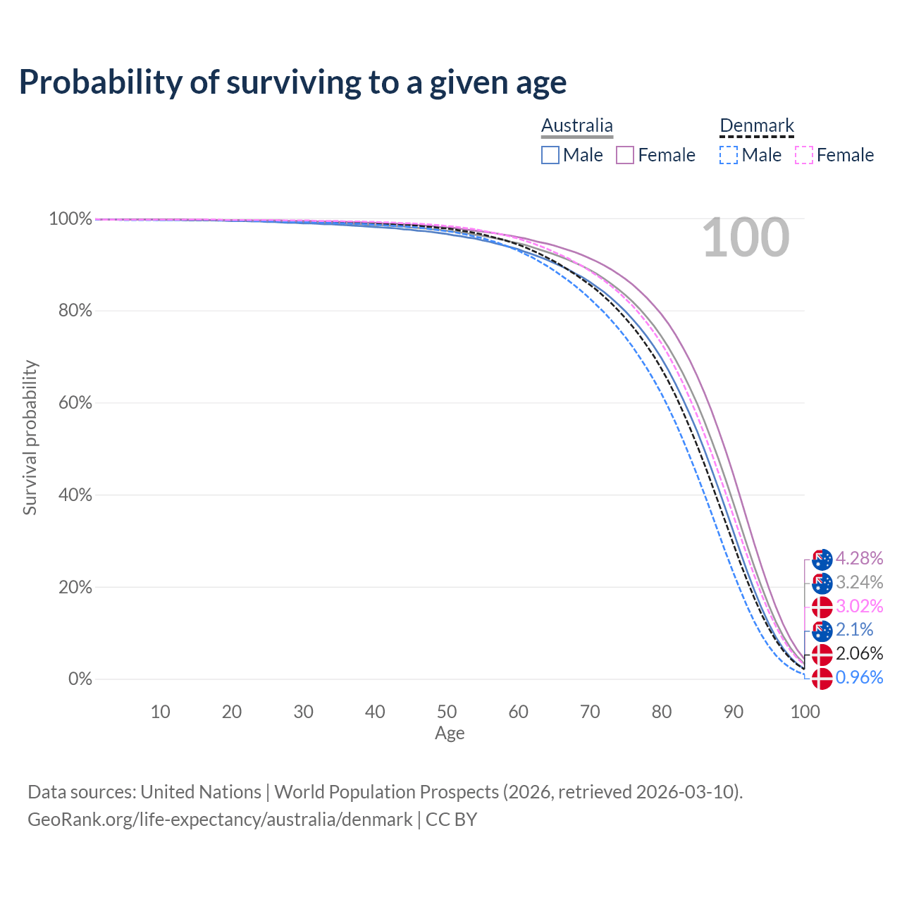This life expectancy calculator shows the odds of living to 100, 95, 90, and below based on current age for both males and females in Australia and Denmark, along with mean and median age of death. The calculations are based on the 2026 life tables (actuarial tables) from the UN World Population Prospects.