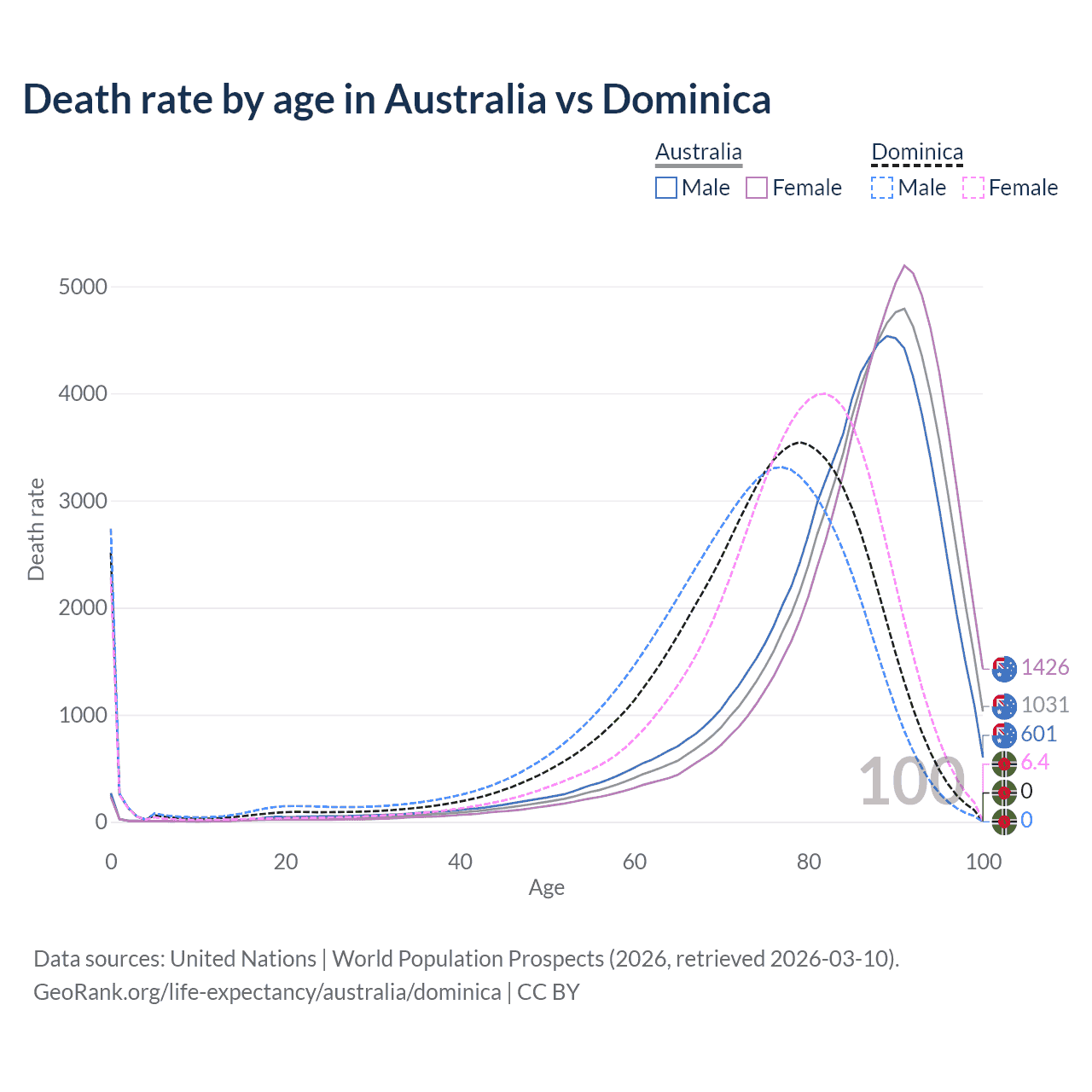 In Australia, the most common age of death is 91, compared to 79 in Dominica. The median age of death is 87.5 in Australia and 75.9 in Dominica, meaning only half of each cohort is expected to live past that age.