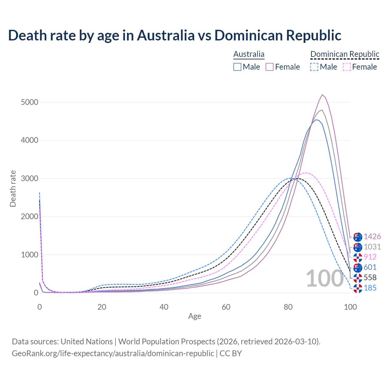 In Australia, the most common age of death is 91, compared to 83 in the Dominican Republic. The median age of death is 87.5 in Australia and 78.9 in the Dominican Republic, meaning only half of each cohort is expected to live past that age.