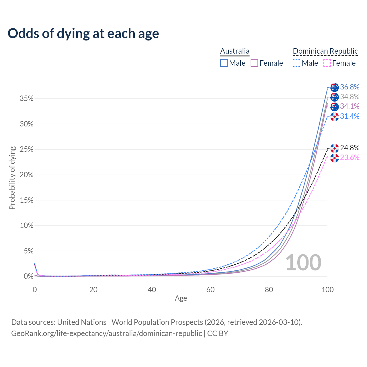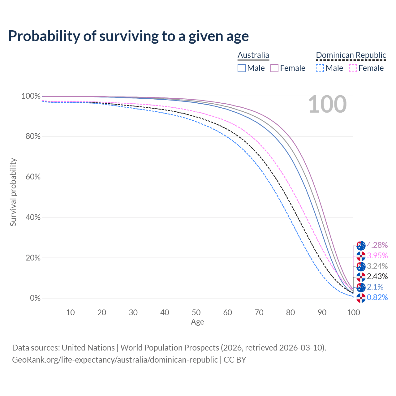 This life expectancy calculator shows the odds of living to 100, 95, 90, and below based on current age for both males and females in Australia and the Dominican Republic, along with mean and median age of death. The calculations are based on the 2026 life tables (actuarial tables) from the UN World Population Prospects.