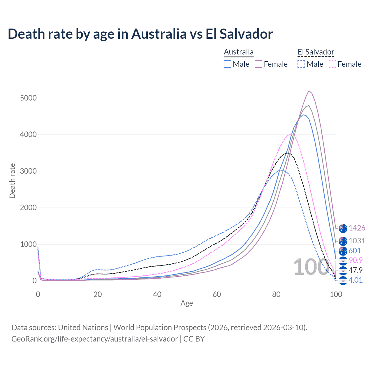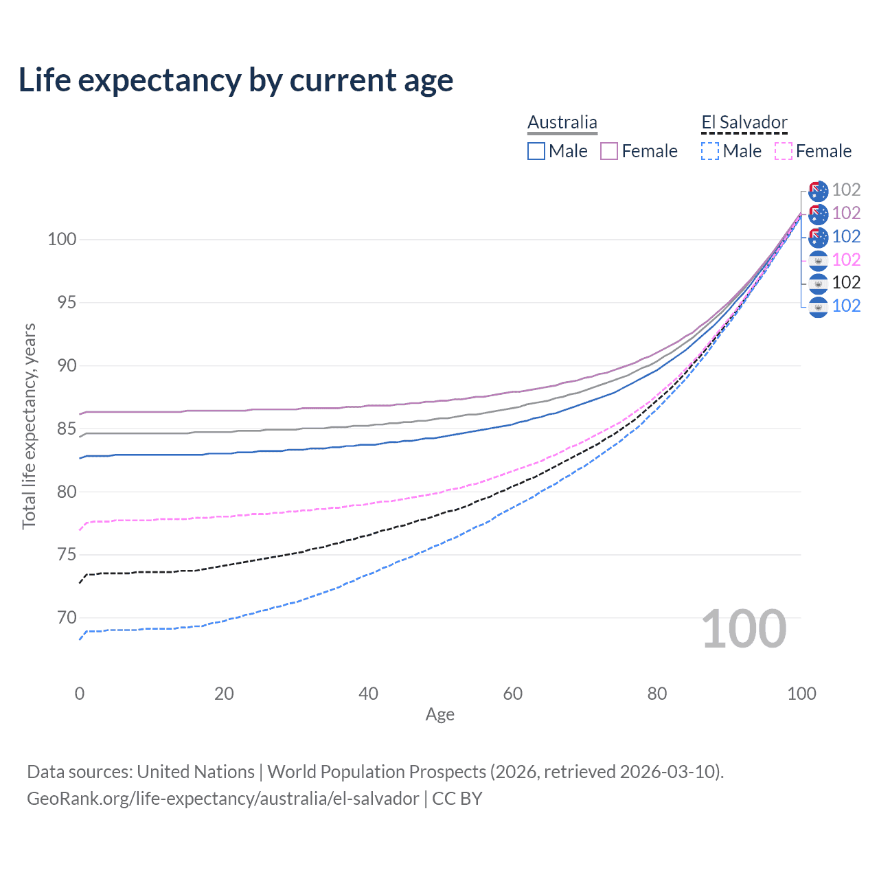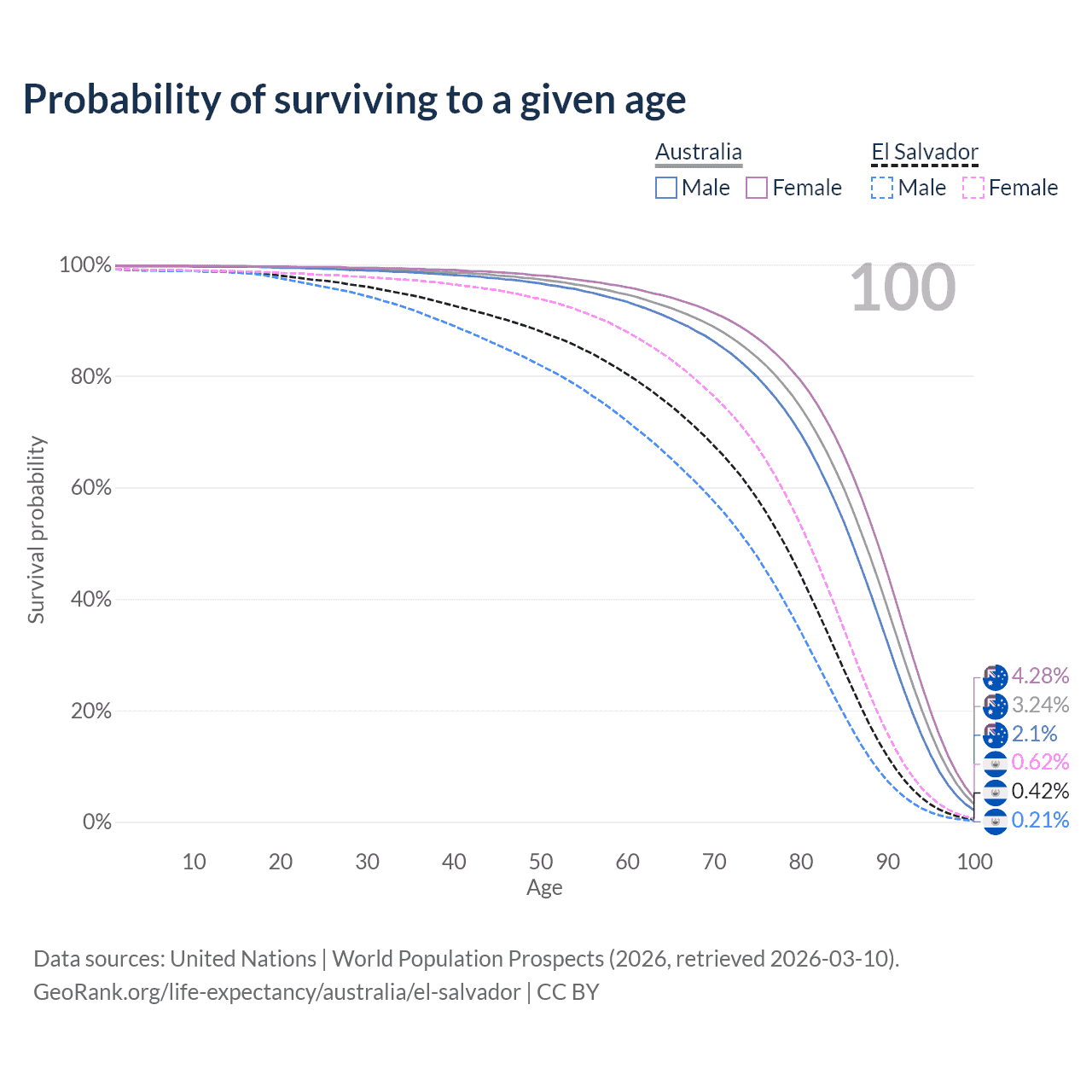 This life expectancy calculator shows the odds of living to 100, 95, 90, and below based on current age for both males and females in Australia and El Salvador, along with mean and median age of death. The calculations are based on the 2026 life tables (actuarial tables) from the UN World Population Prospects.