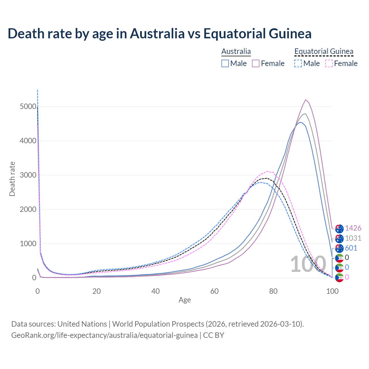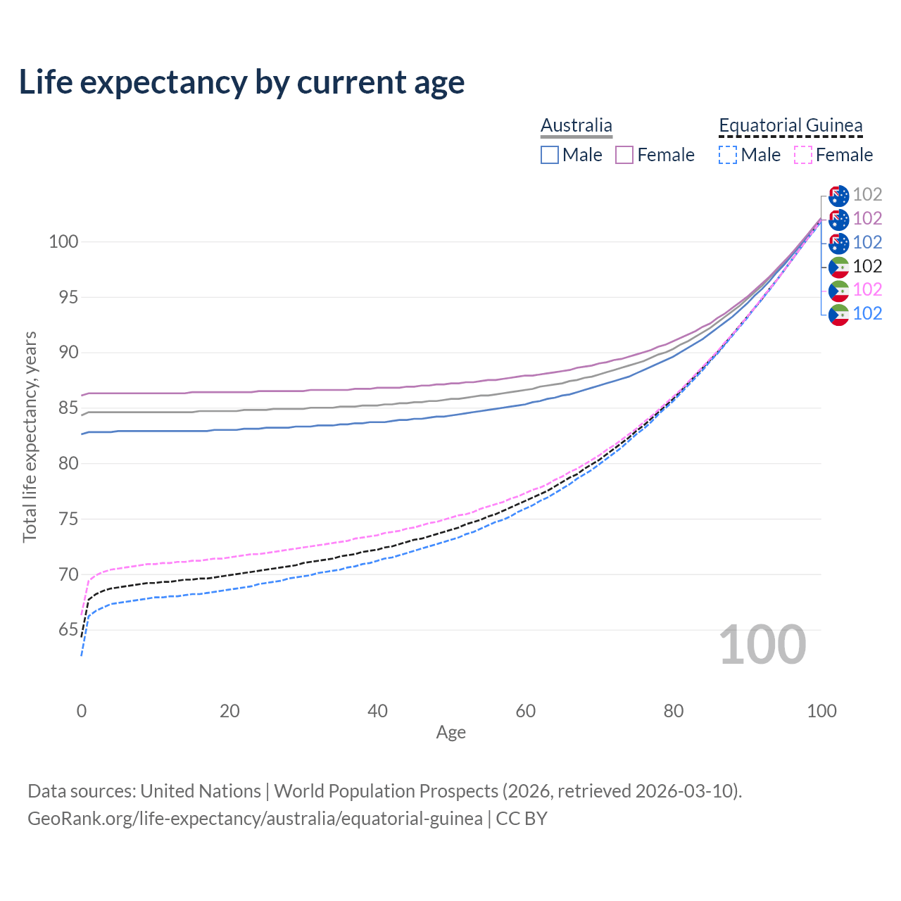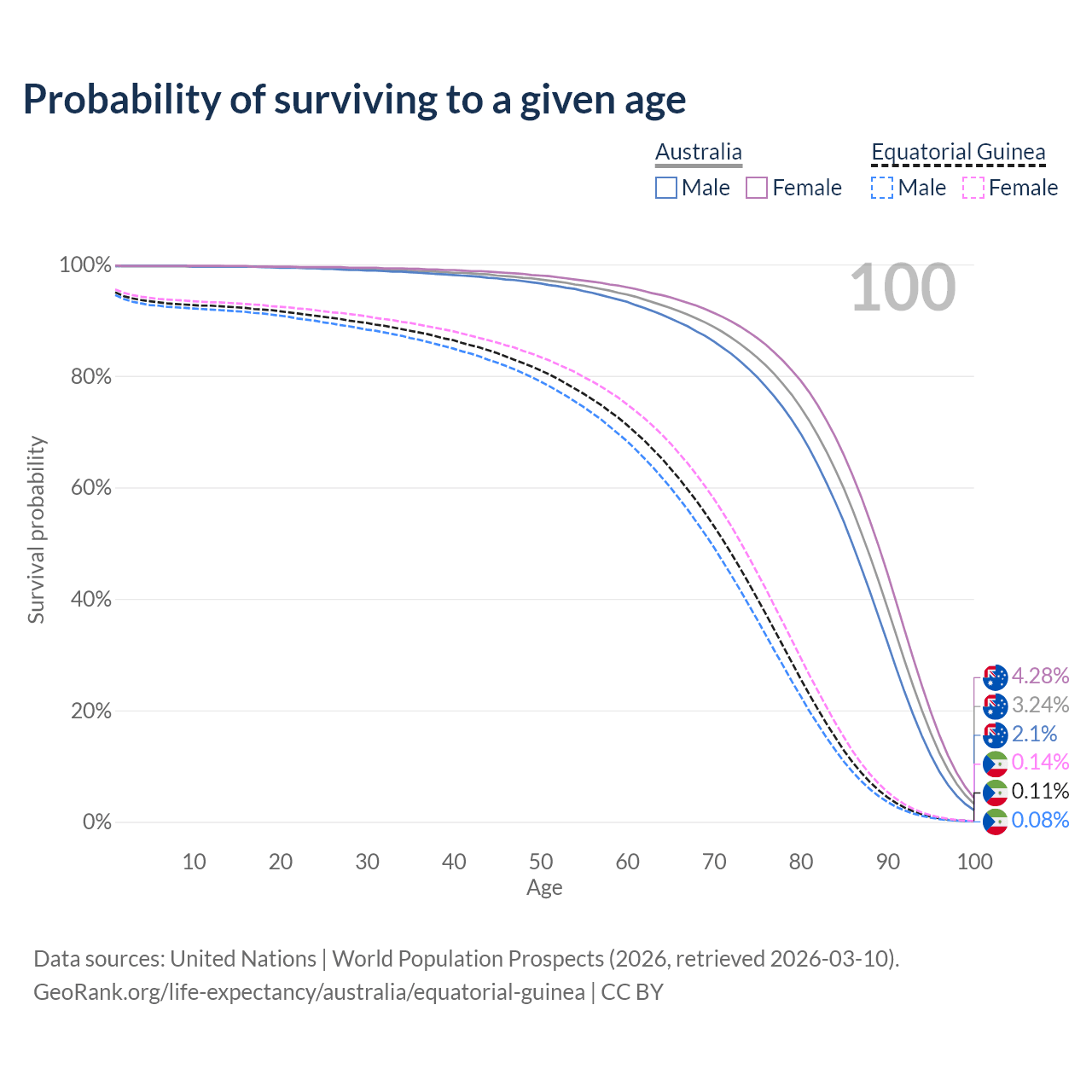 This life expectancy calculator shows the odds of living to 100, 95, 90, and below based on current age for both males and females in Australia and Equatorial Guinea, along with mean and median age of death. The calculations are based on the 2026 life tables (actuarial tables) from the UN World Population Prospects.