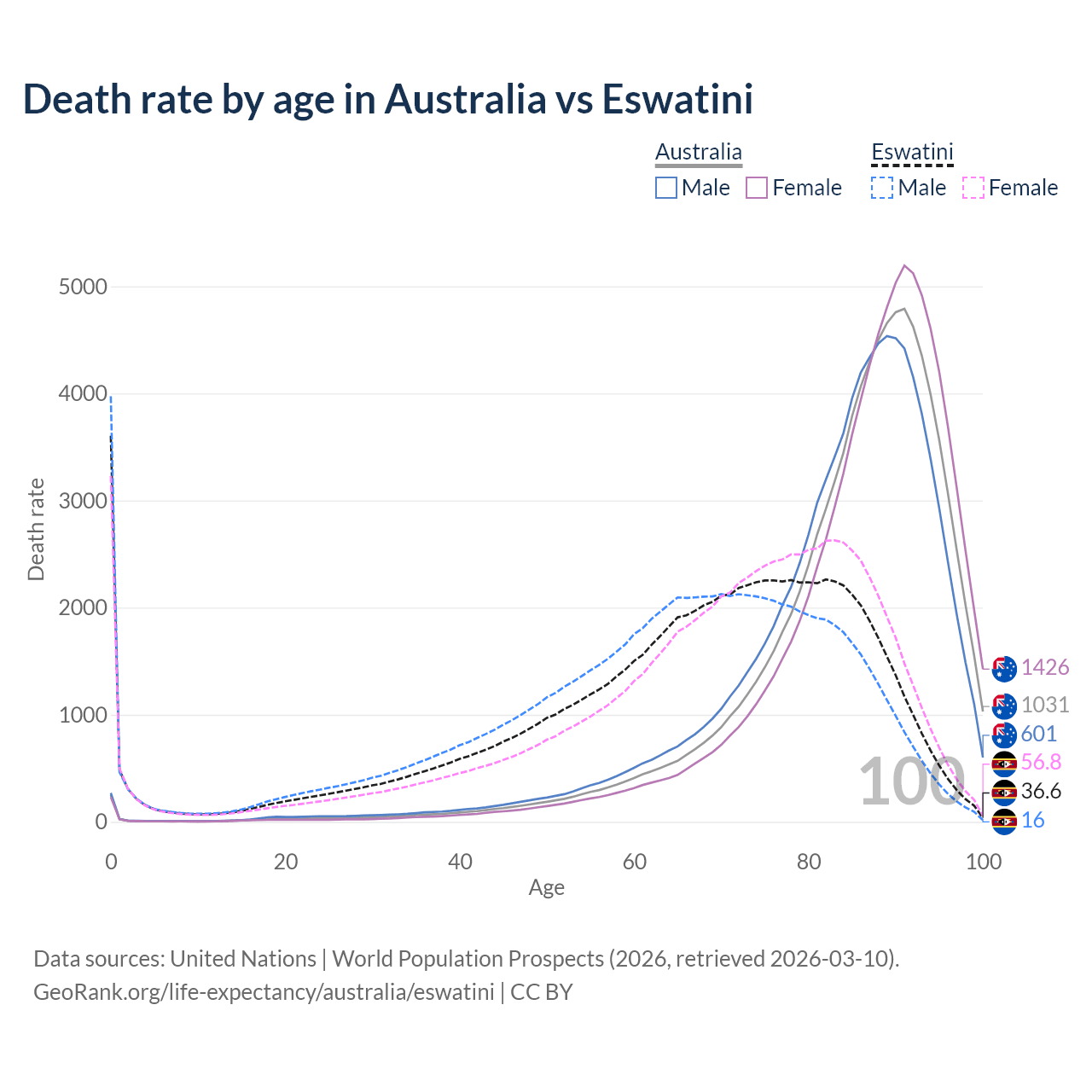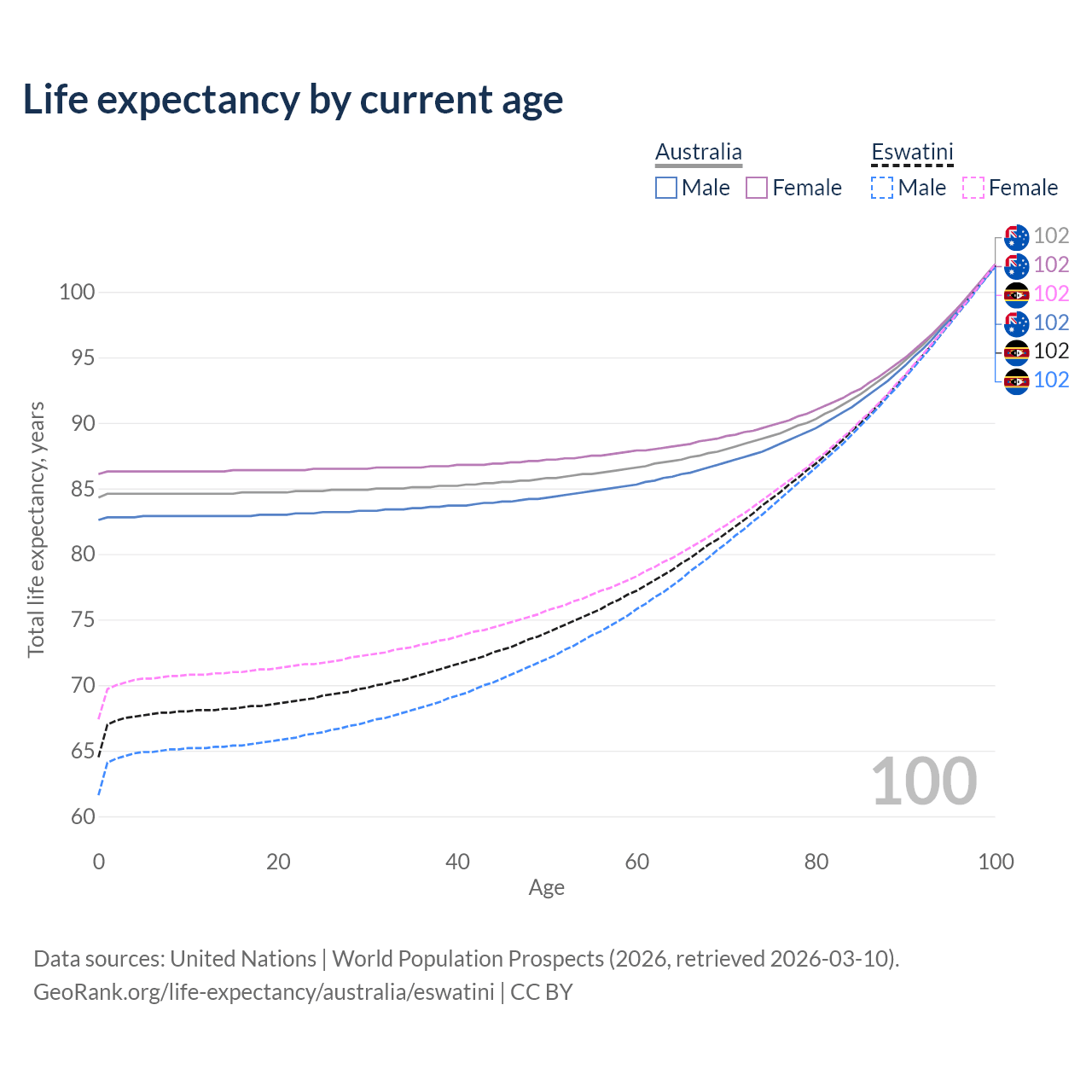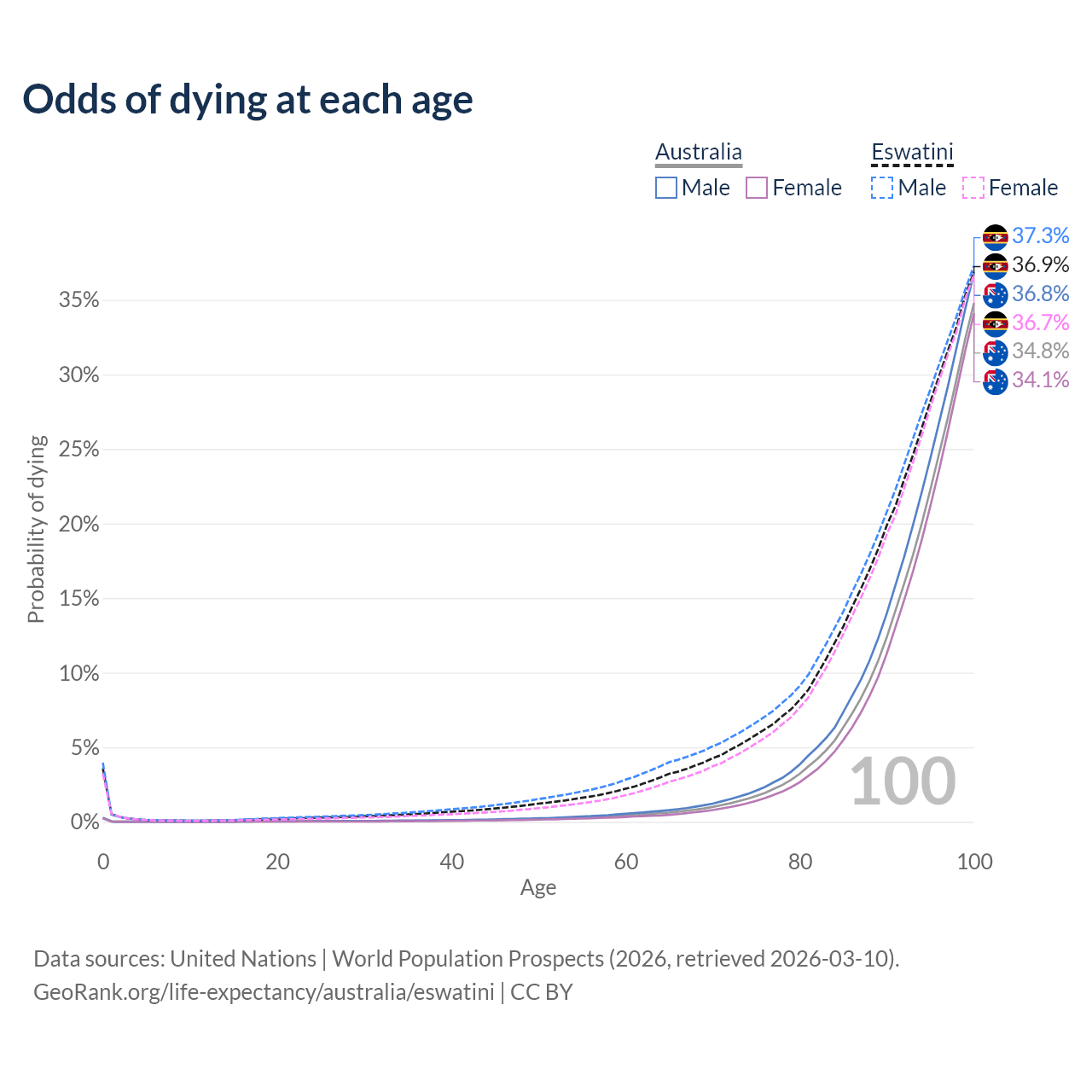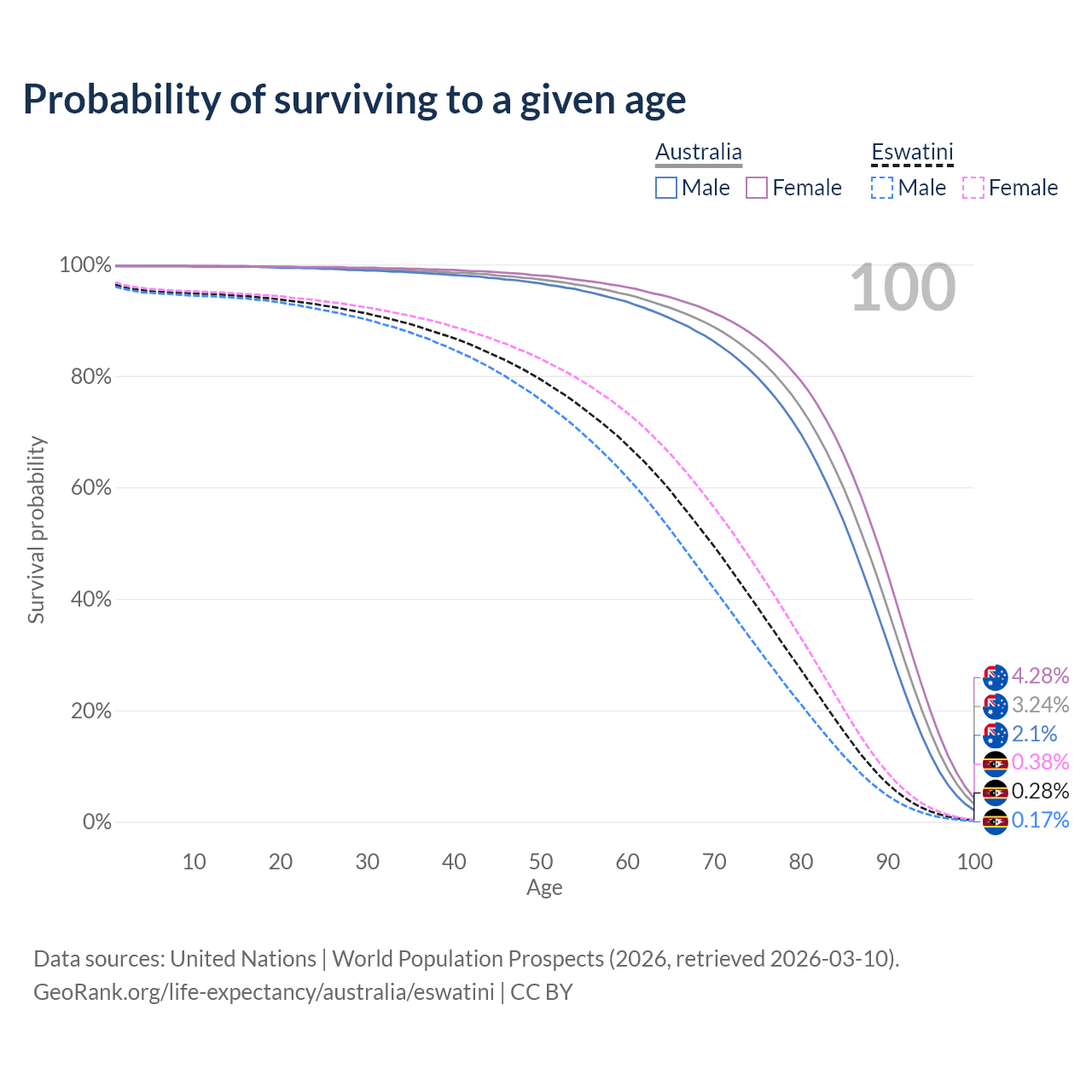 This life expectancy calculator shows the odds of living to 100, 95, 90, and below based on current age for both males and females in Australia and Eswatini, along with mean and median age of death. The calculations are based on the 2026 life tables (actuarial tables) from the UN World Population Prospects.
