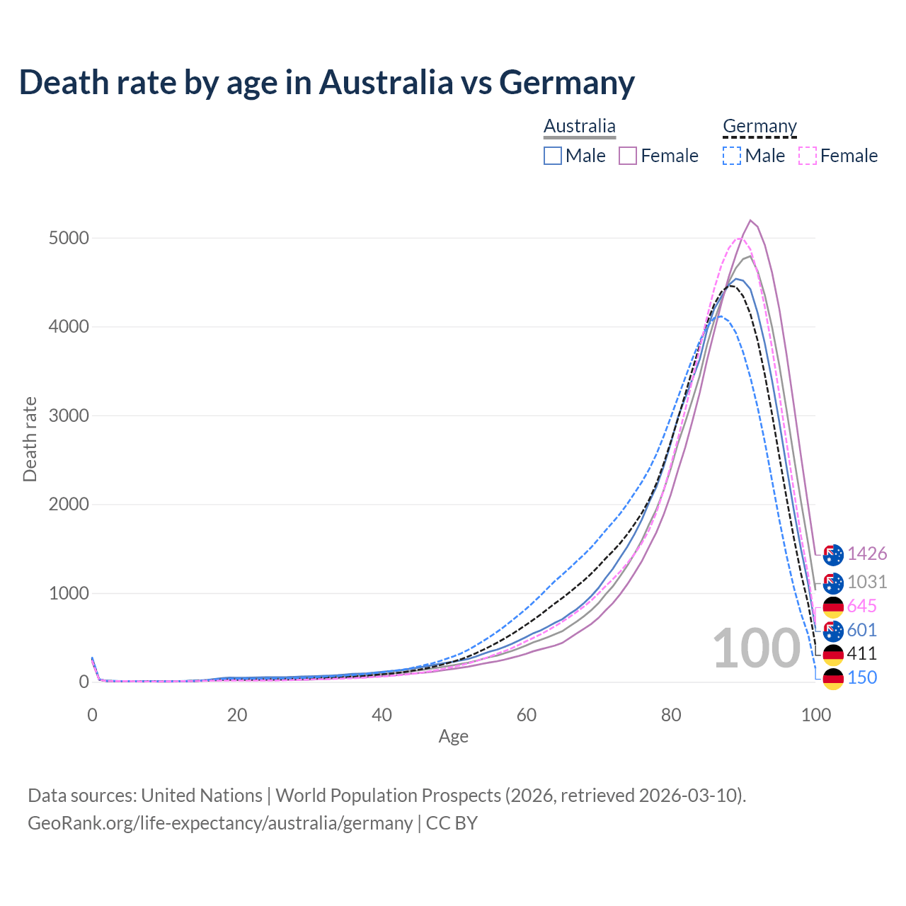 In Australia, the most common age of death is 91, compared to 88 in Germany. The median age of death is 87.5 in Australia and 85.1 in Germany, meaning only half of each cohort is expected to live past that age.