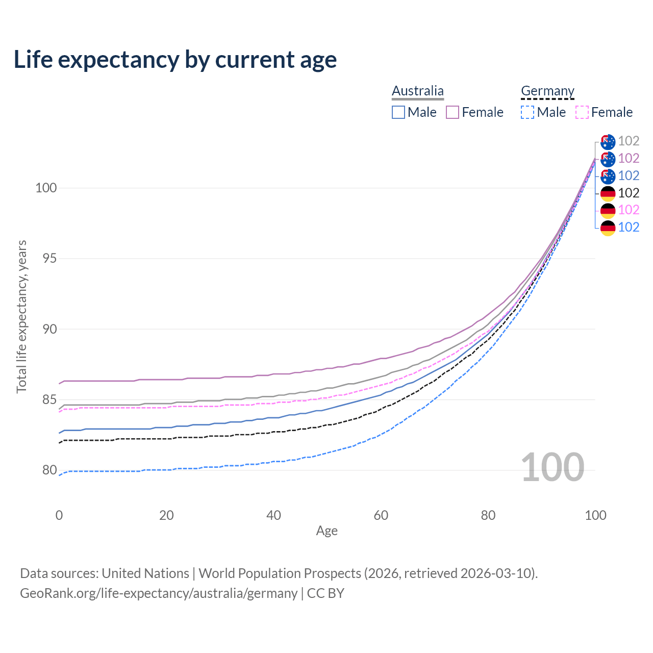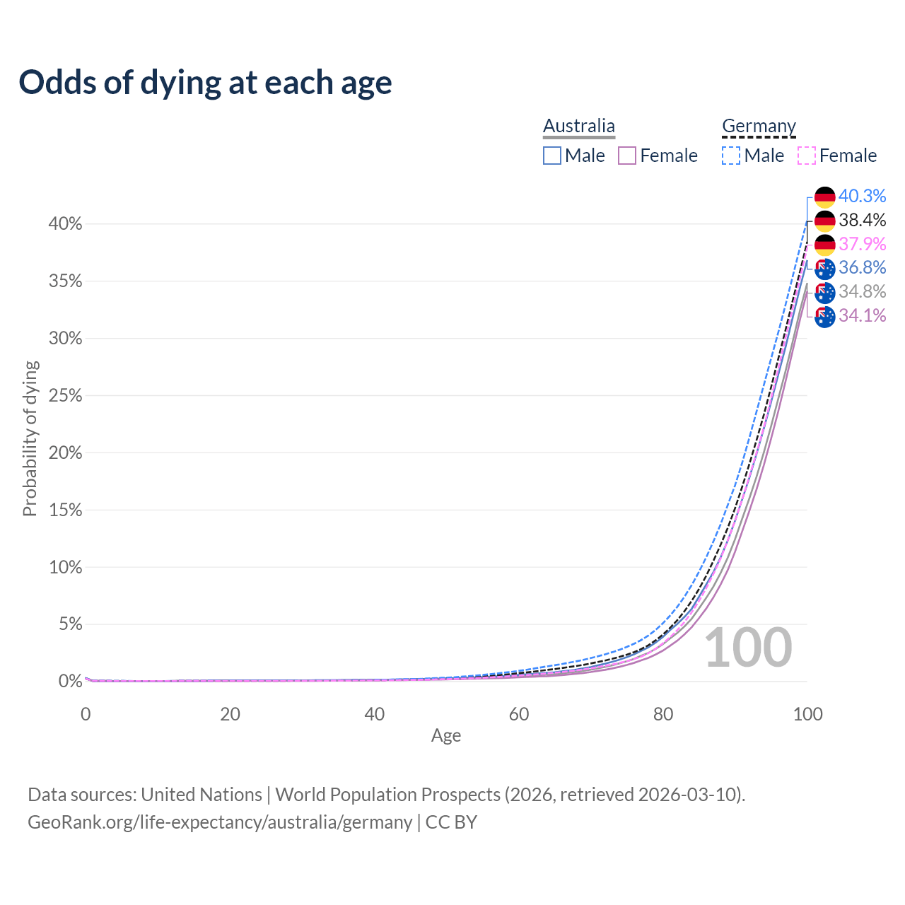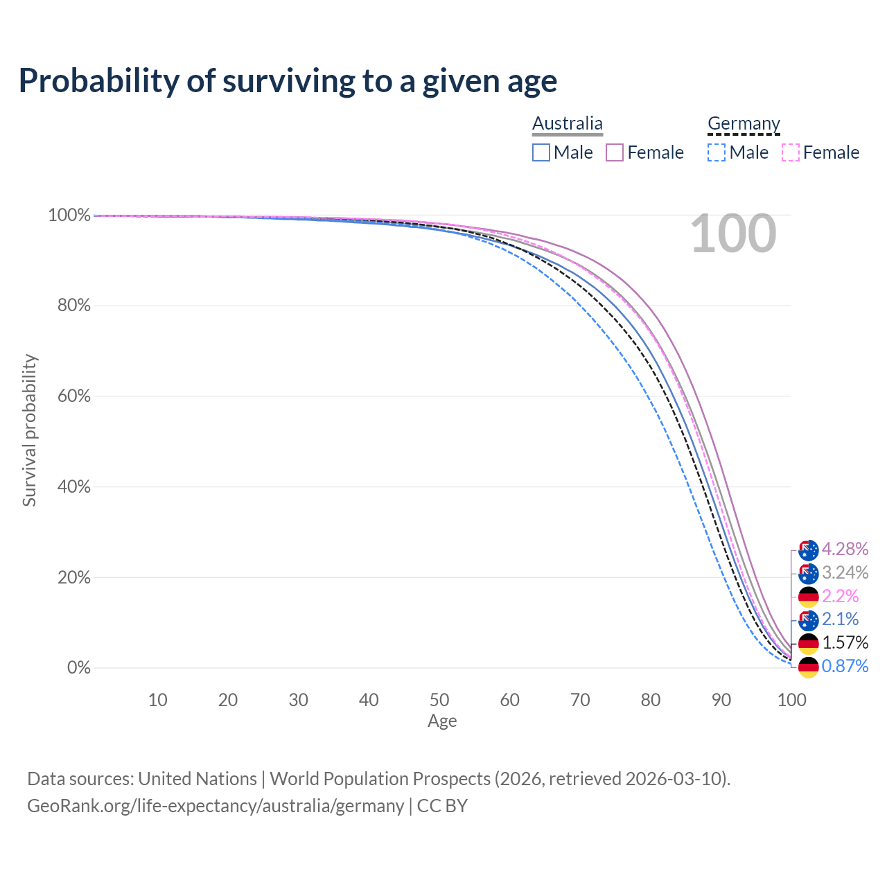 This life expectancy calculator shows the odds of living to 100, 95, 90, and below based on current age for both males and females in Australia and Germany, along with mean and median age of death. The calculations are based on the 2026 life tables (actuarial tables) from the UN World Population Prospects.
