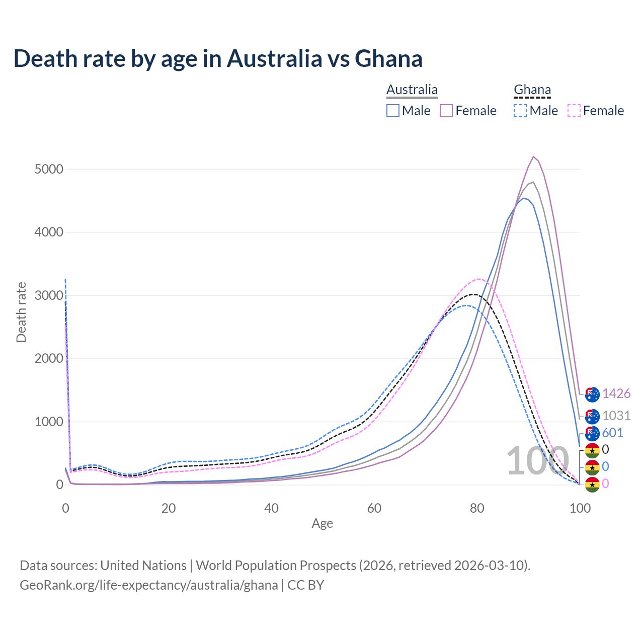 In Australia, the most common age of death is 91, compared to 79 in Ghana. The median age of death is 87.5 in Australia and 73 in Ghana, meaning only half of each cohort is expected to live past that age.