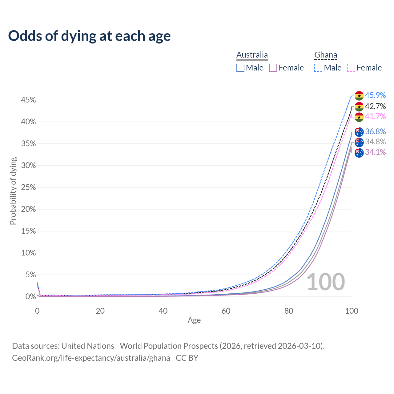 This life expectancy calculator shows the odds of living to 100, 95, 90, and below based on current age for both males and females in Australia and Ghana, along with mean and median age of death. The calculations are based on the 2026 life tables (actuarial tables) from the UN World Population Prospects.