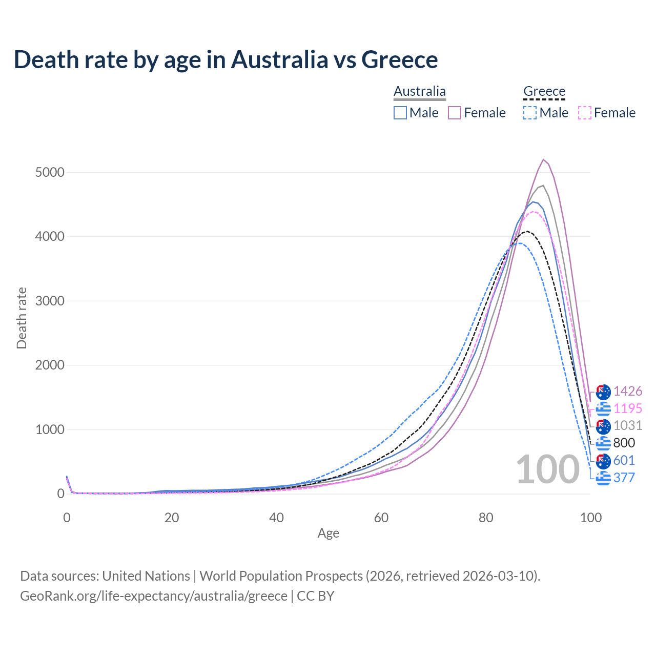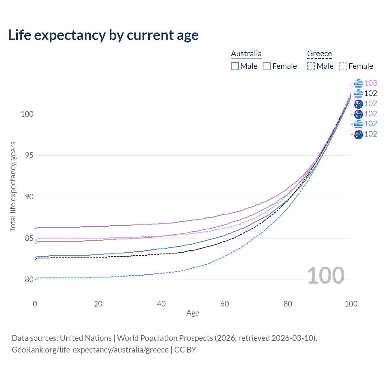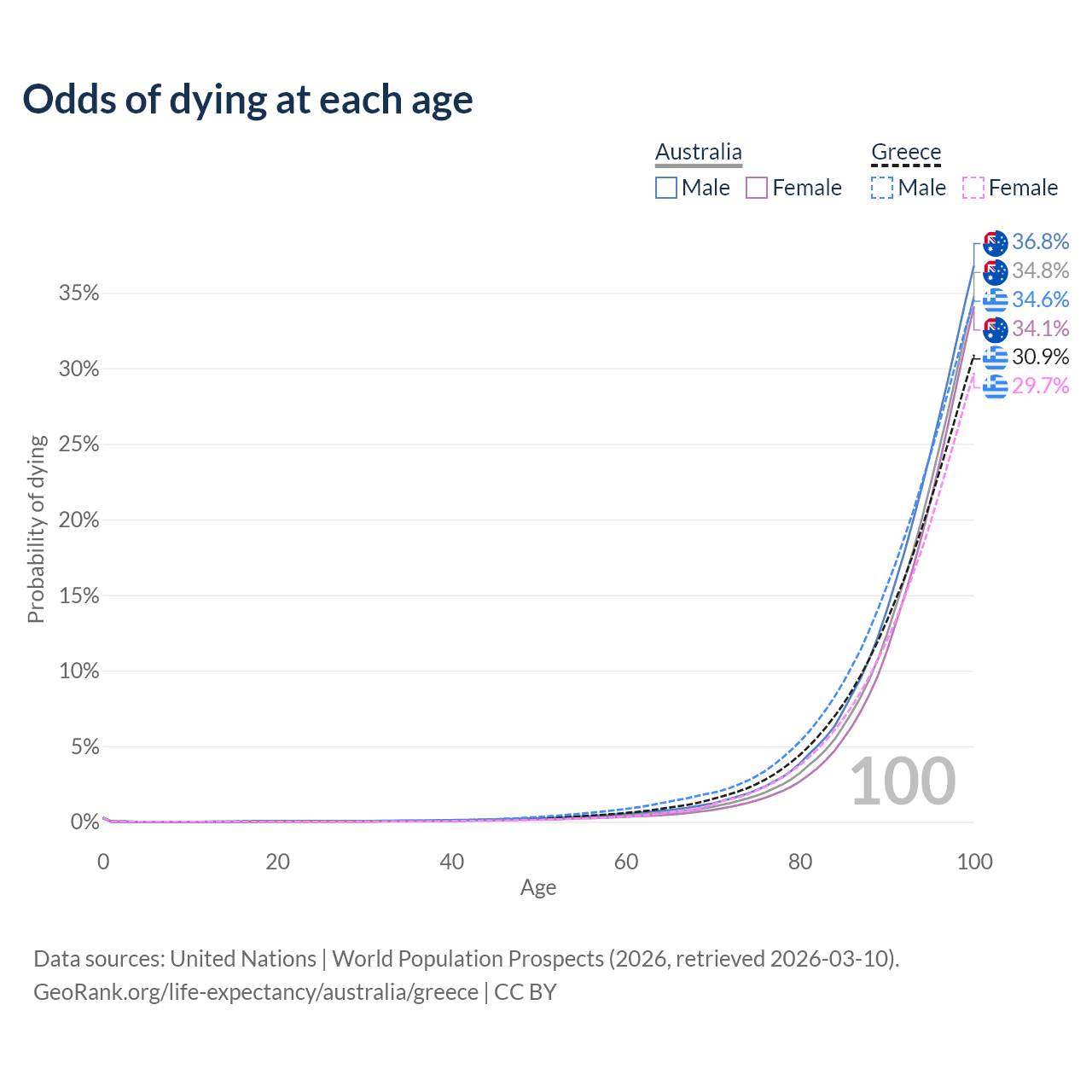 This life expectancy calculator shows the odds of living to 100, 95, 90, and below based on current age for both males and females in Australia and Greece, along with mean and median age of death. The calculations are based on the 2026 life tables (actuarial tables) from the UN World Population Prospects.