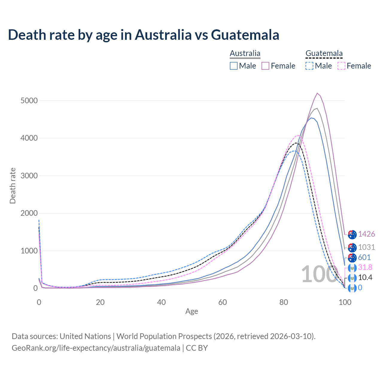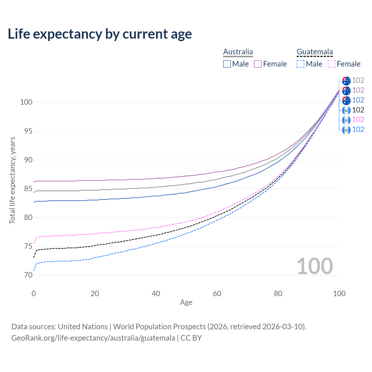 This life expectancy calculator shows the odds of living to 100, 95, 90, and below based on current age for both males and females in Australia and Guatemala, along with mean and median age of death. The calculations are based on the 2026 life tables (actuarial tables) from the UN World Population Prospects.