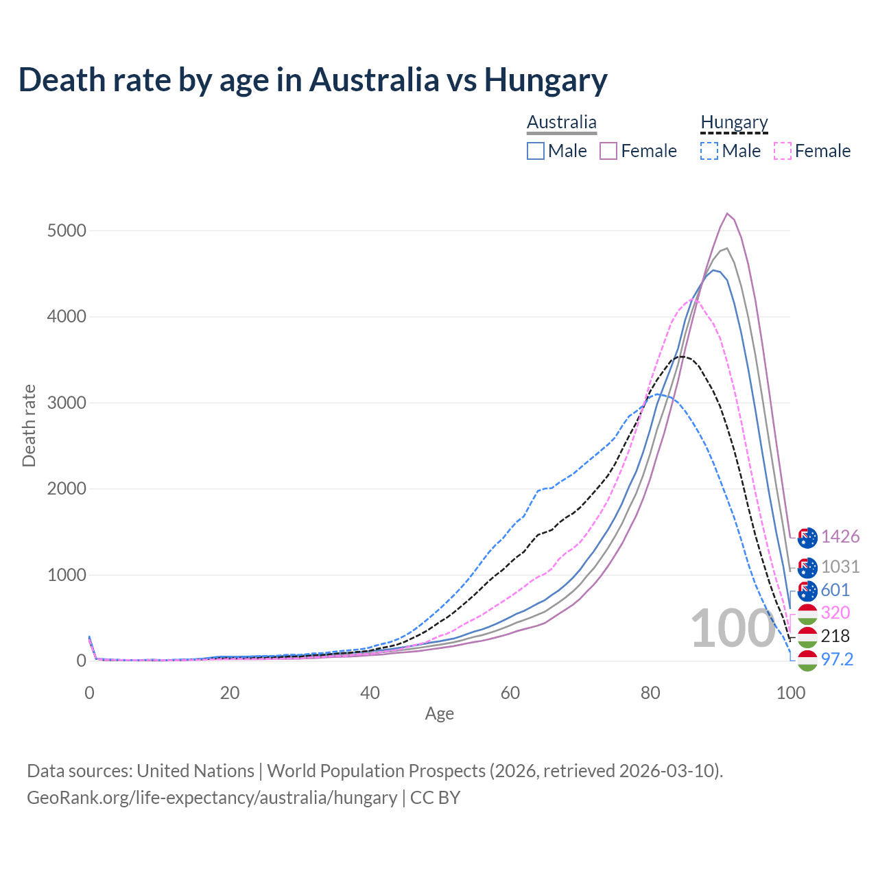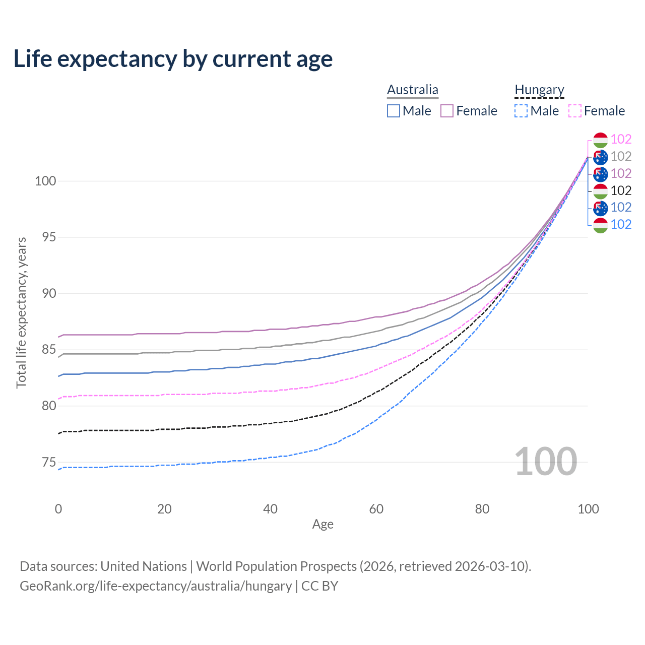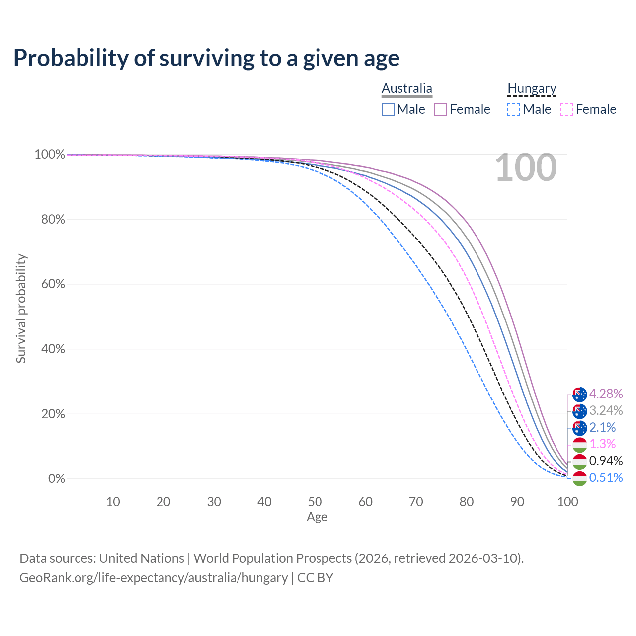 This life expectancy calculator shows the odds of living to 100, 95, 90, and below based on current age for both males and females in Australia and Hungary, along with mean and median age of death. The calculations are based on the 2026 life tables (actuarial tables) from the UN World Population Prospects.