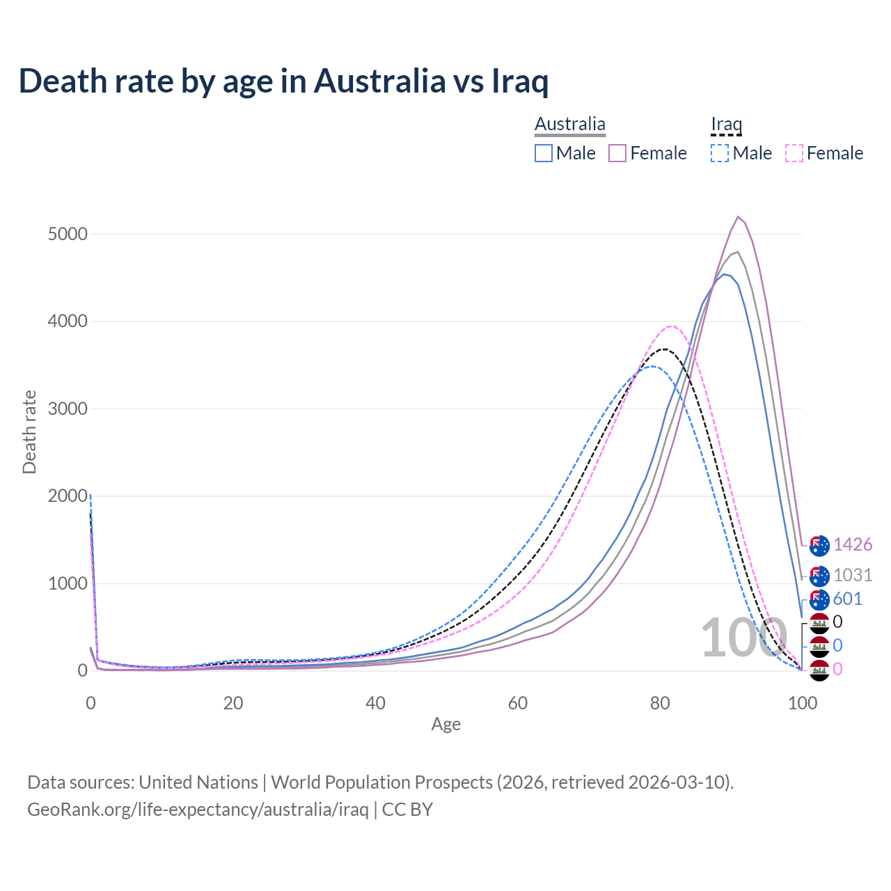In Australia, the most common age of death is 91, compared to 81 in Iraq. The median age of death is 87.5 in Australia and 76.7 in Iraq, meaning only half of each cohort is expected to live past that age.