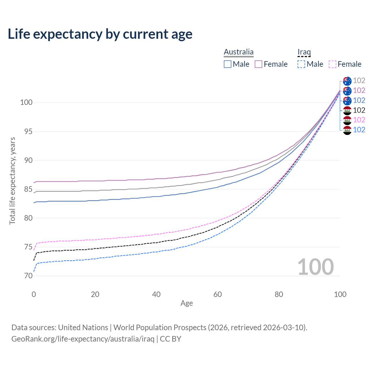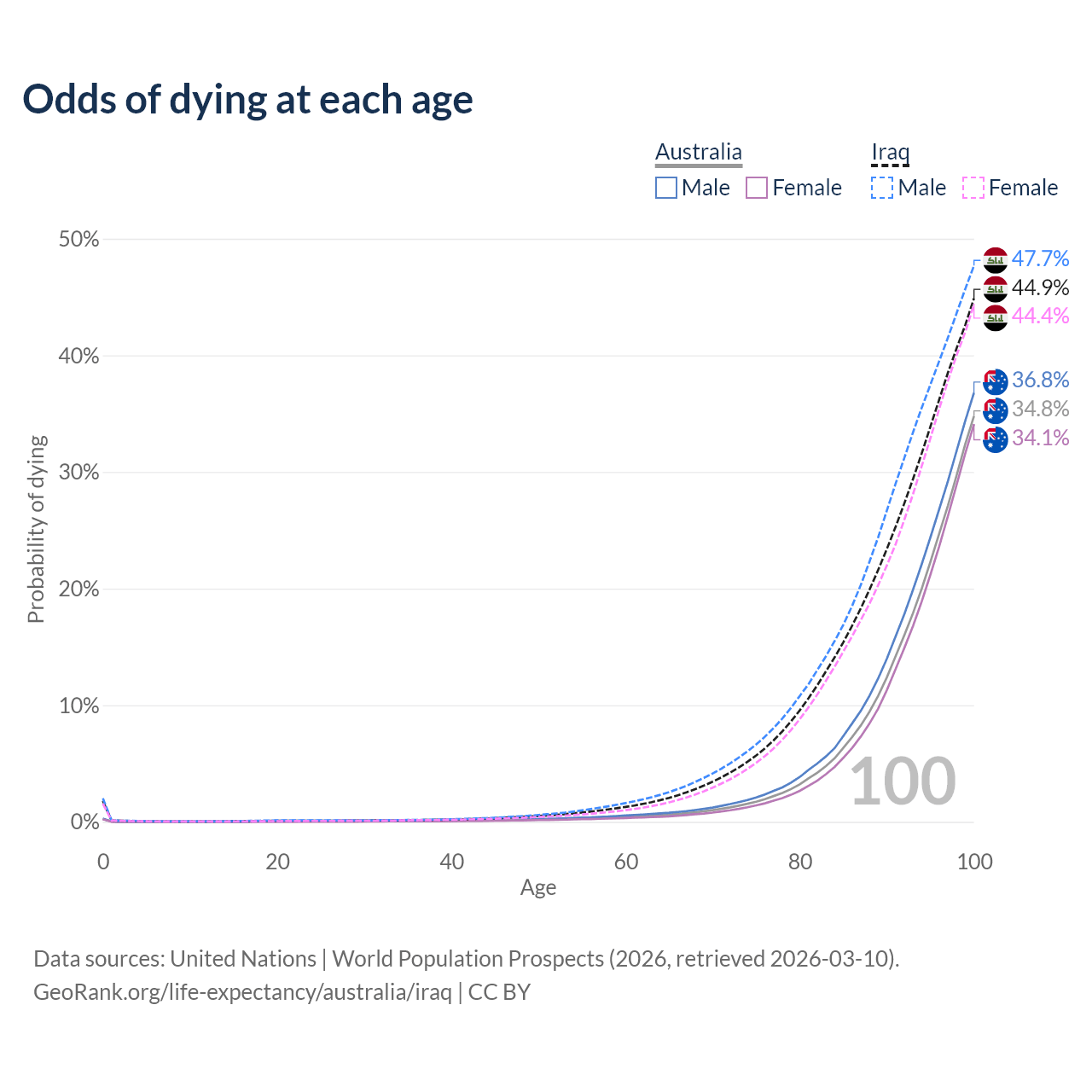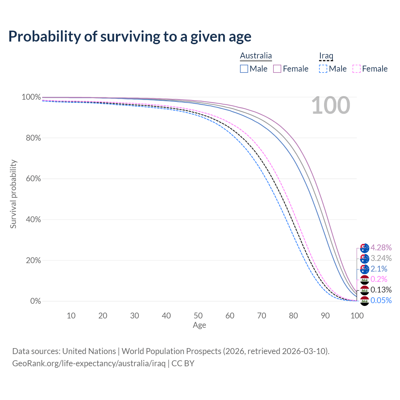 This life expectancy calculator shows the odds of living to 100, 95, 90, and below based on current age for both males and females in Australia and Iraq, along with mean and median age of death. The calculations are based on the 2026 life tables (actuarial tables) from the UN World Population Prospects.