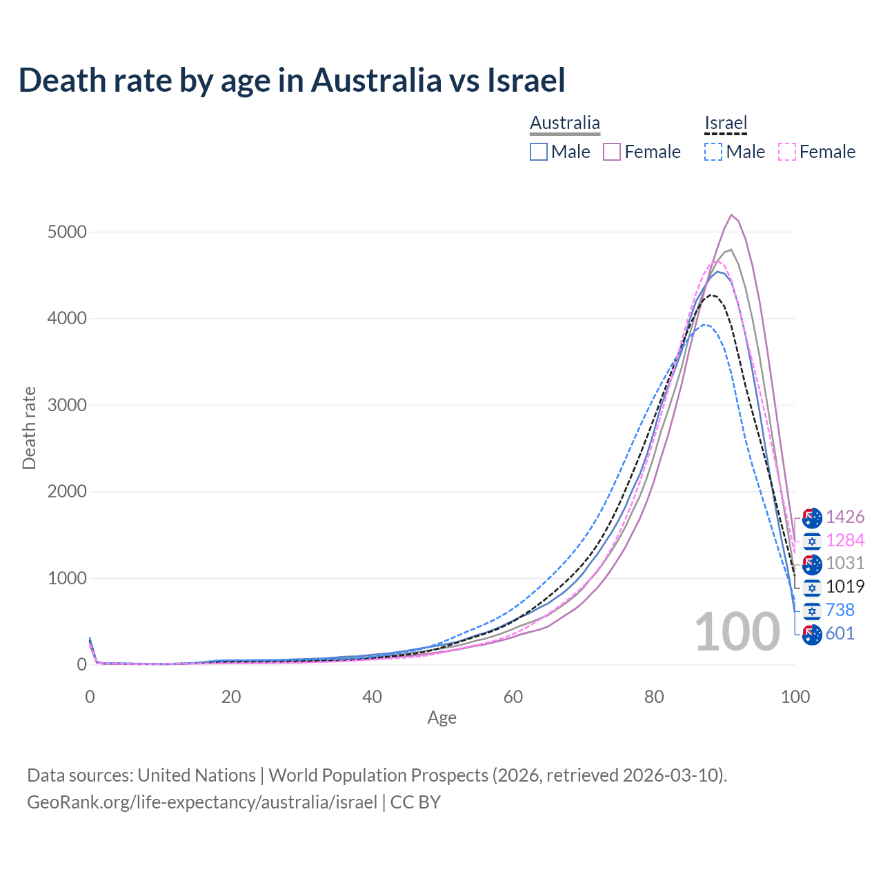 In Australia, the most common age of death is 91, compared to 88 in Israel. The median age of death is 87.5 in Australia and 85.6 in Israel, meaning only half of each cohort is expected to live past that age.