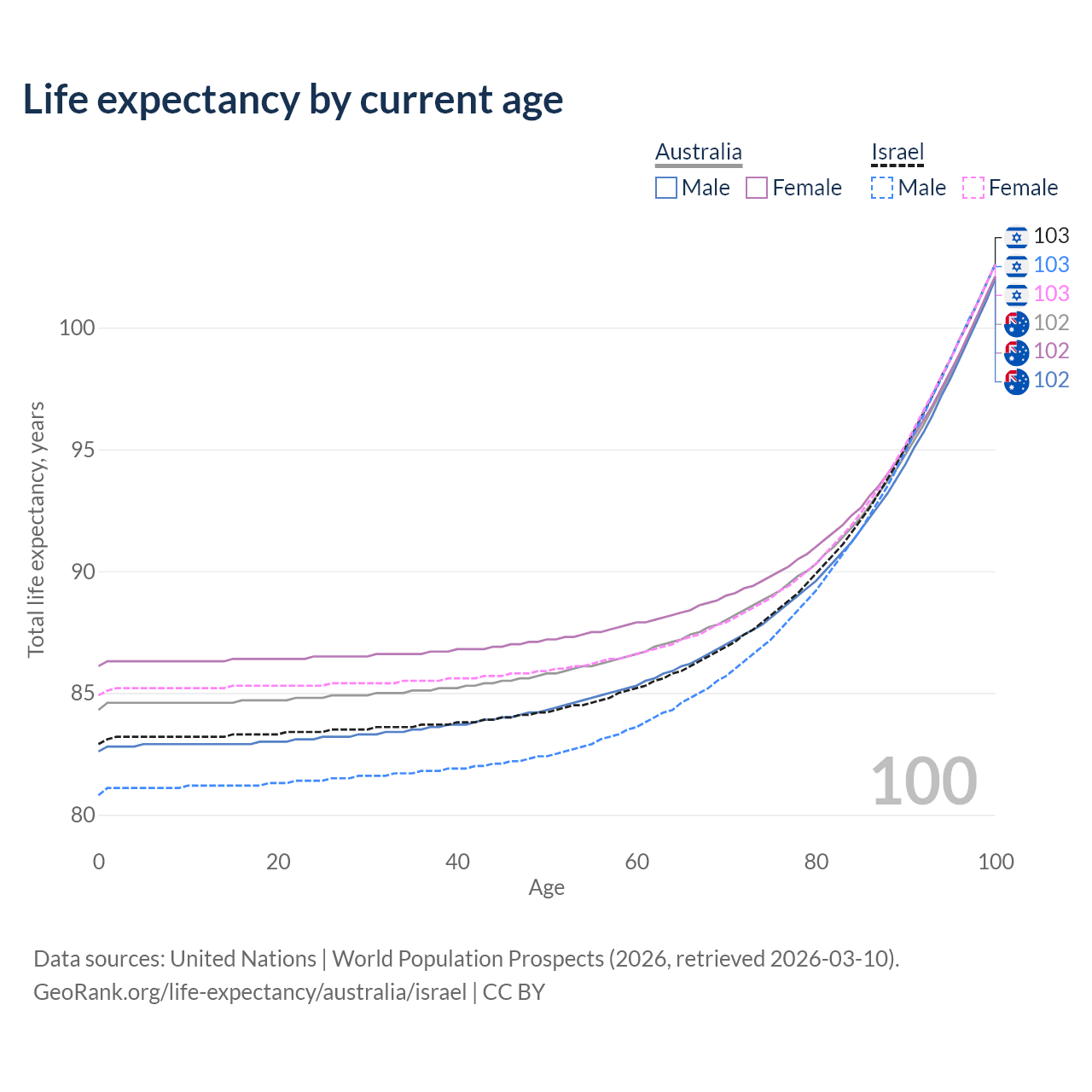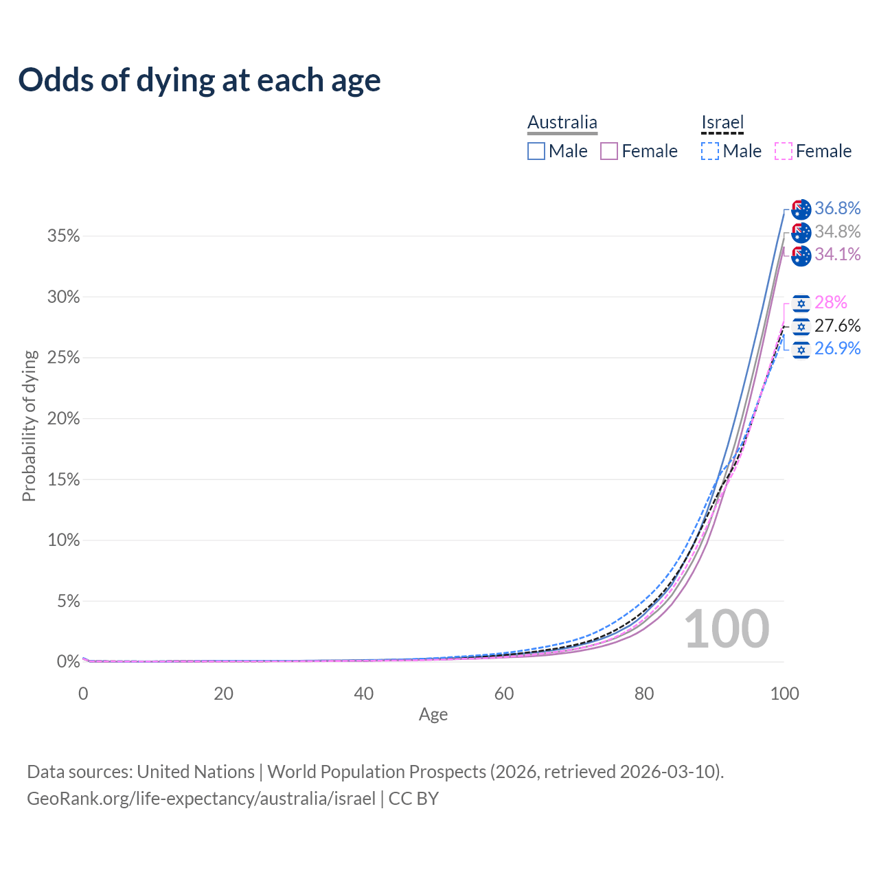 This life expectancy calculator shows the odds of living to 100, 95, 90, and below based on current age for both males and females in Australia and Israel, along with mean and median age of death. The calculations are based on the 2026 life tables (actuarial tables) from the UN World Population Prospects.