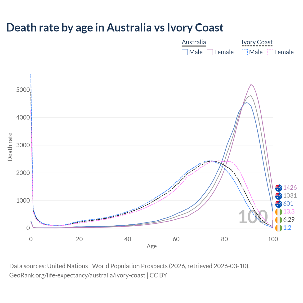 In Australia, the most common age of death is 91, compared to 0 in Ivory Coast. The median age of death is 87.5 in Australia and 68.6 in Ivory Coast, meaning only half of each cohort is expected to live past that age.
