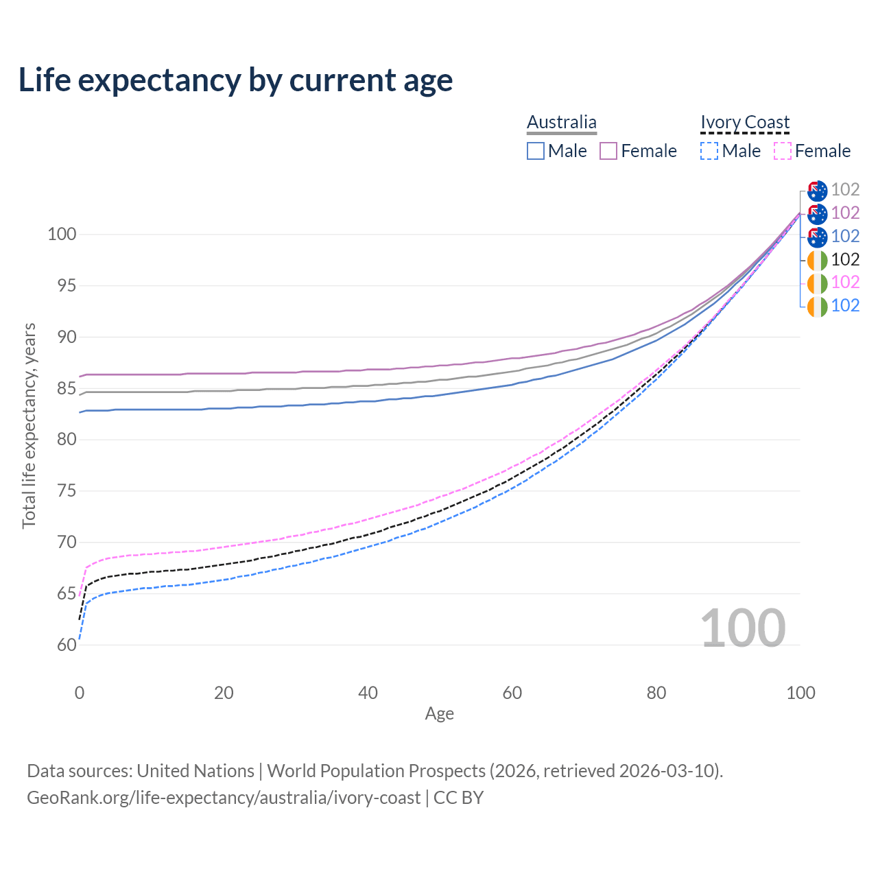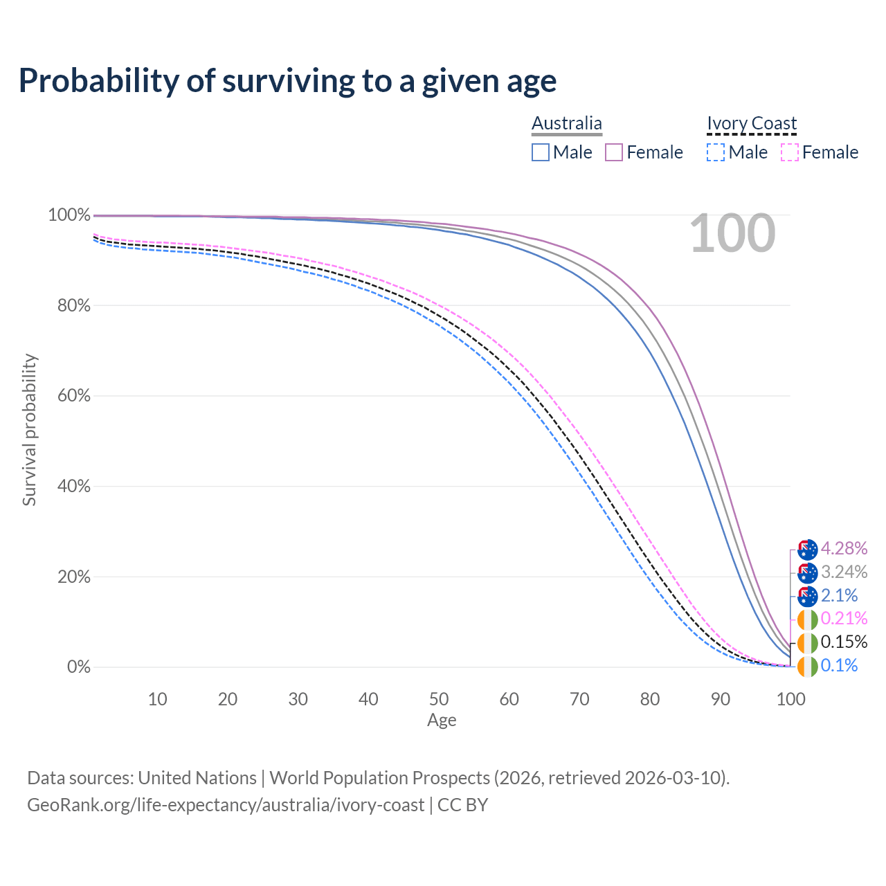 This life expectancy calculator shows the odds of living to 100, 95, 90, and below based on current age for both males and females in Australia and Ivory Coast, along with mean and median age of death. The calculations are based on the 2026 life tables (actuarial tables) from the UN World Population Prospects.