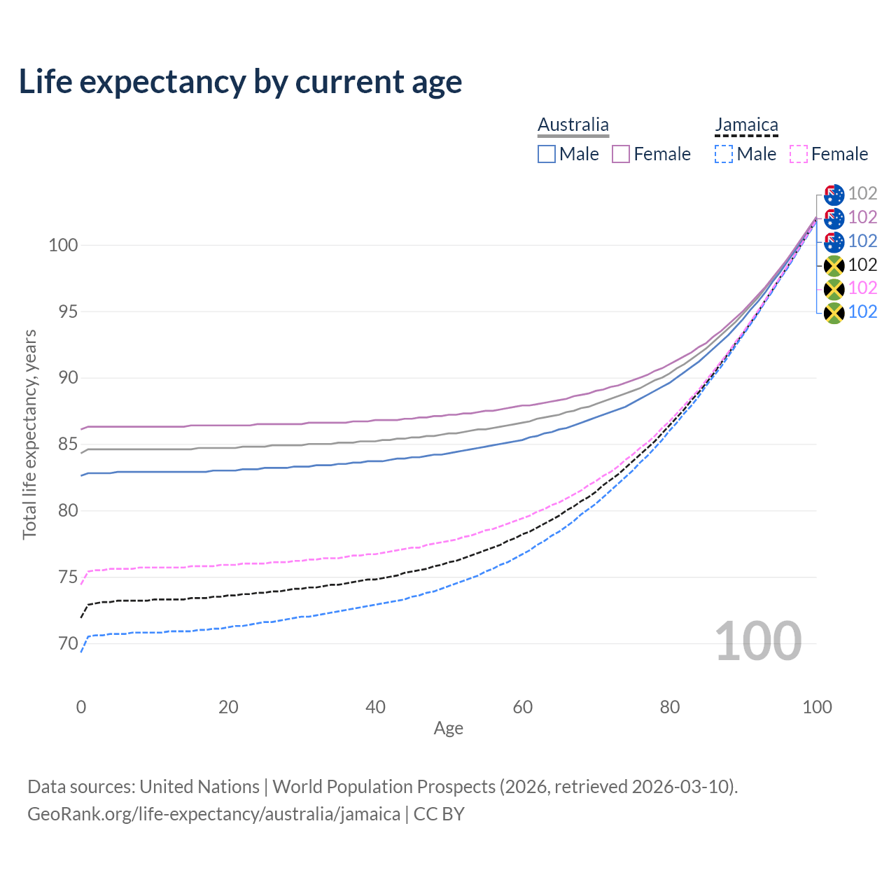This life expectancy calculator shows the odds of living to 100, 95, 90, and below based on current age for both males and females in Australia and Jamaica, along with mean and median age of death. The calculations are based on the 2026 life tables (actuarial tables) from the UN World Population Prospects.
