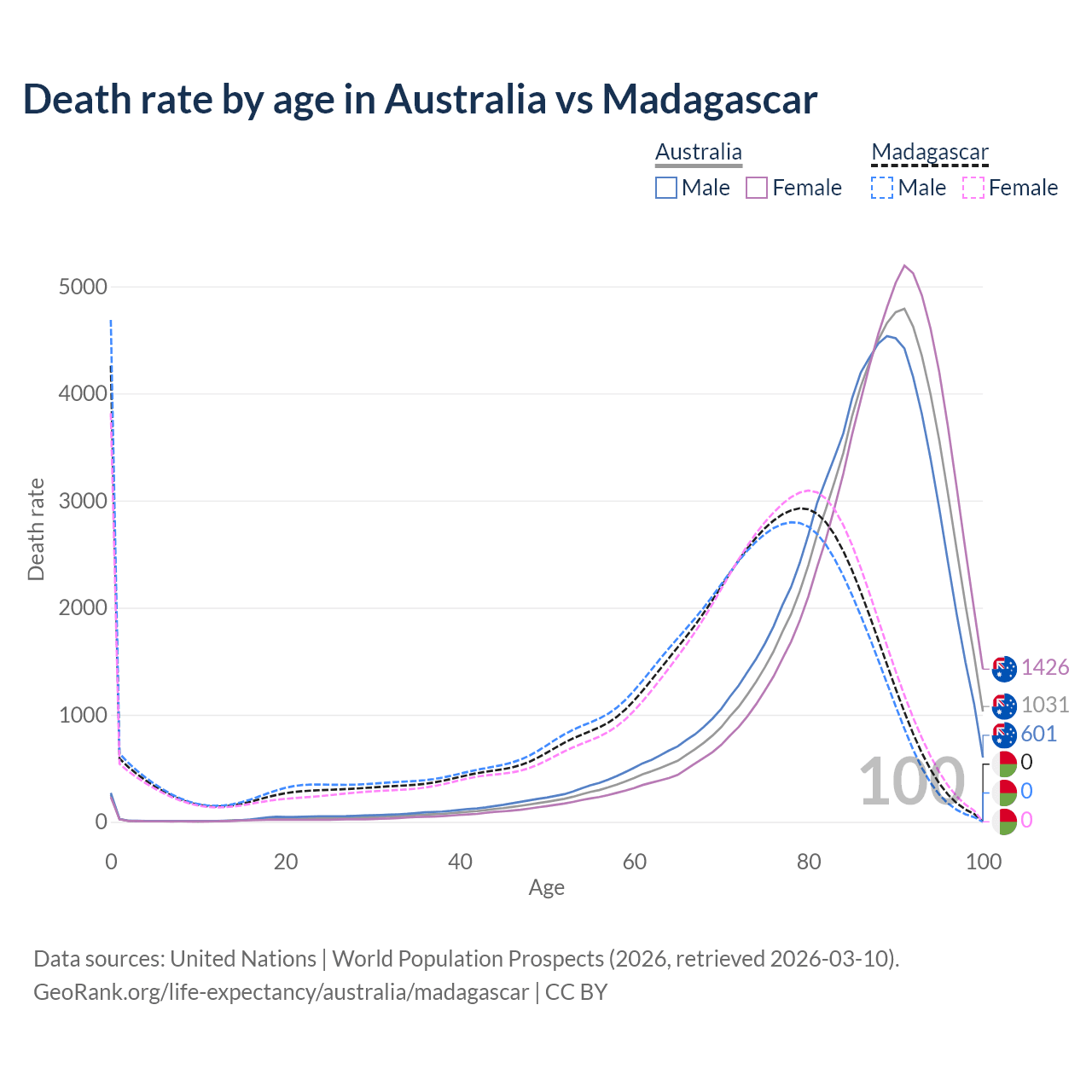 In Australia, the most common age of death is 91, compared to 0 in Madagascar. The median age of death is 87.5 in Australia and 72.2 in Madagascar, meaning only half of each cohort is expected to live past that age.