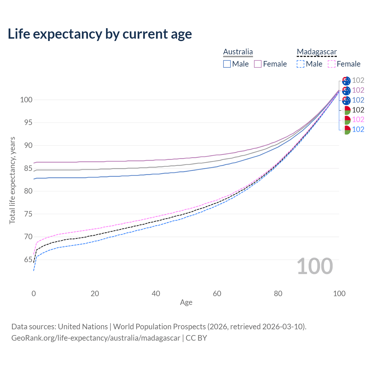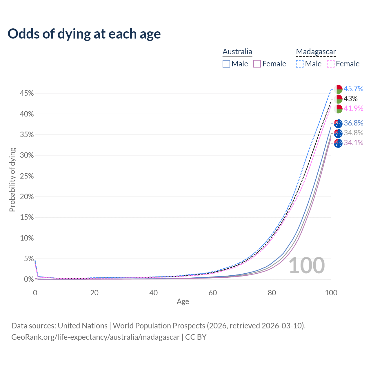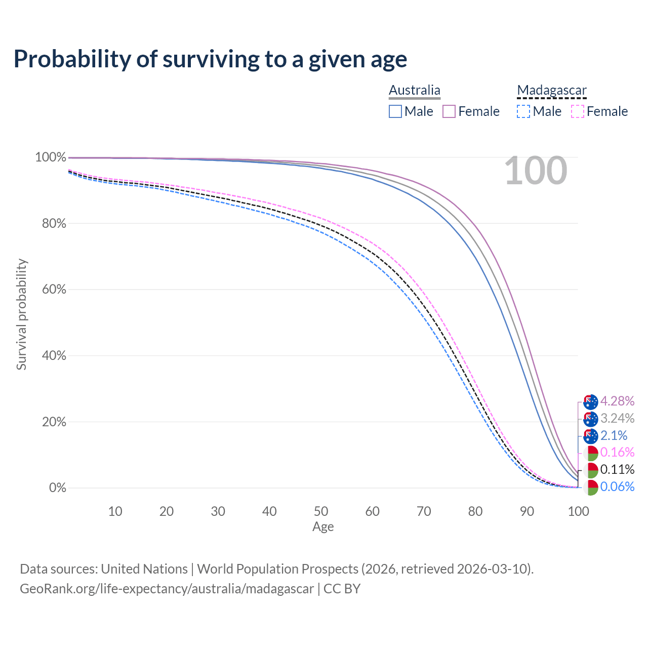 This life expectancy calculator shows the odds of living to 100, 95, 90, and below based on current age for both males and females in Australia and Madagascar, along with mean and median age of death. The calculations are based on the 2026 life tables (actuarial tables) from the UN World Population Prospects.