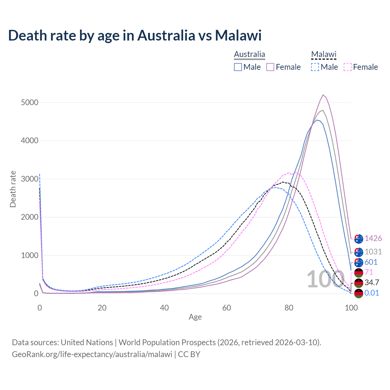 In Australia, the most common age of death is 91, compared to 78 in Malawi. The median age of death is 87.5 in Australia and 73.1 in Malawi, meaning only half of each cohort is expected to live past that age.