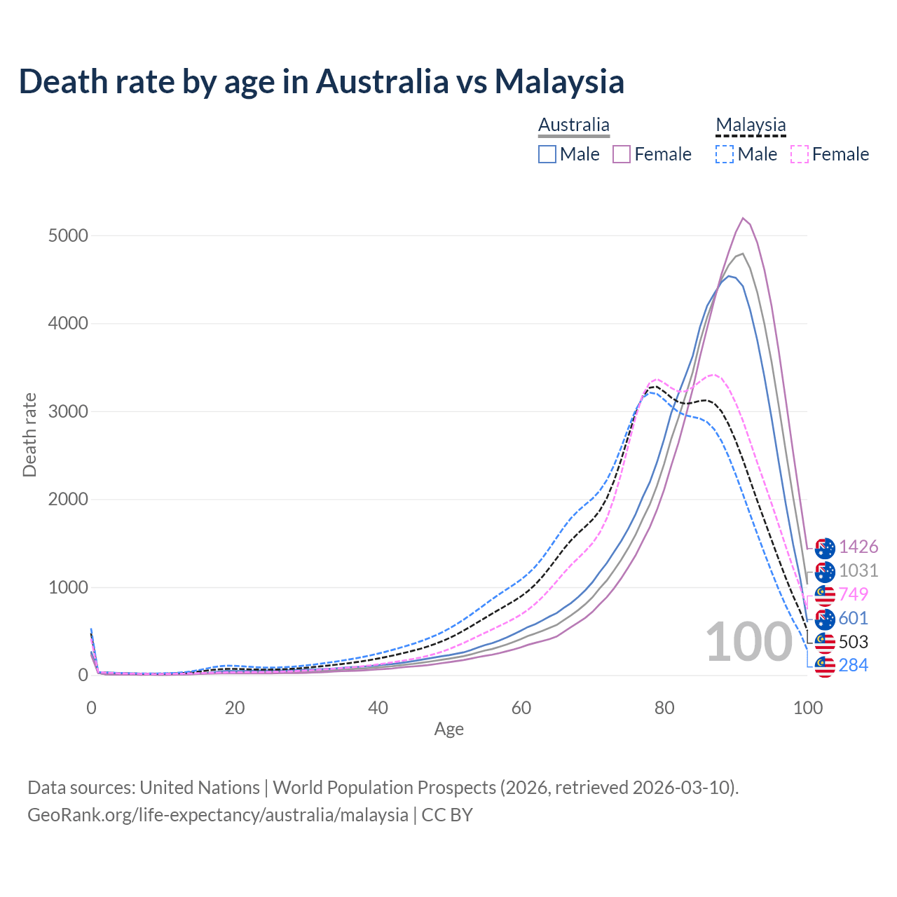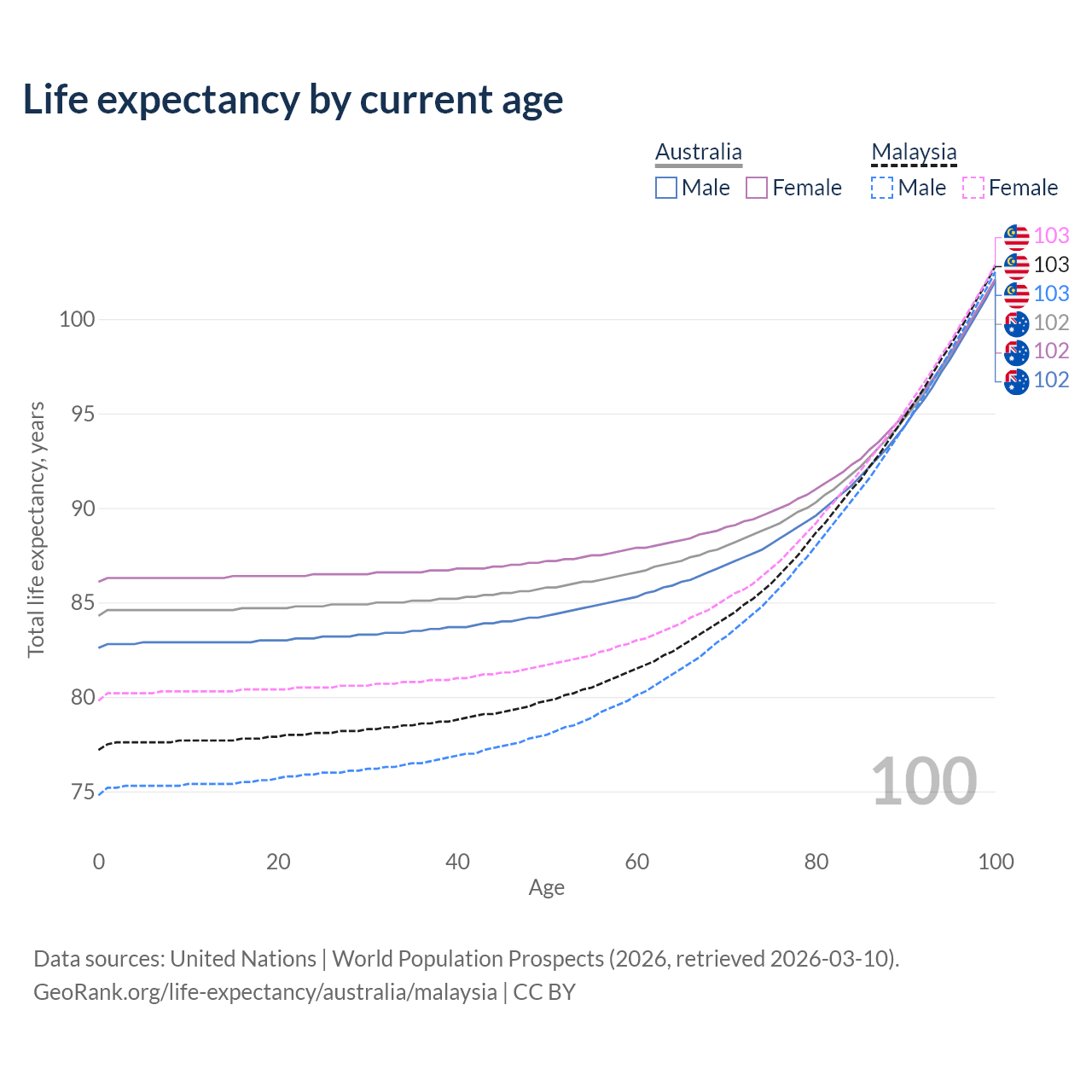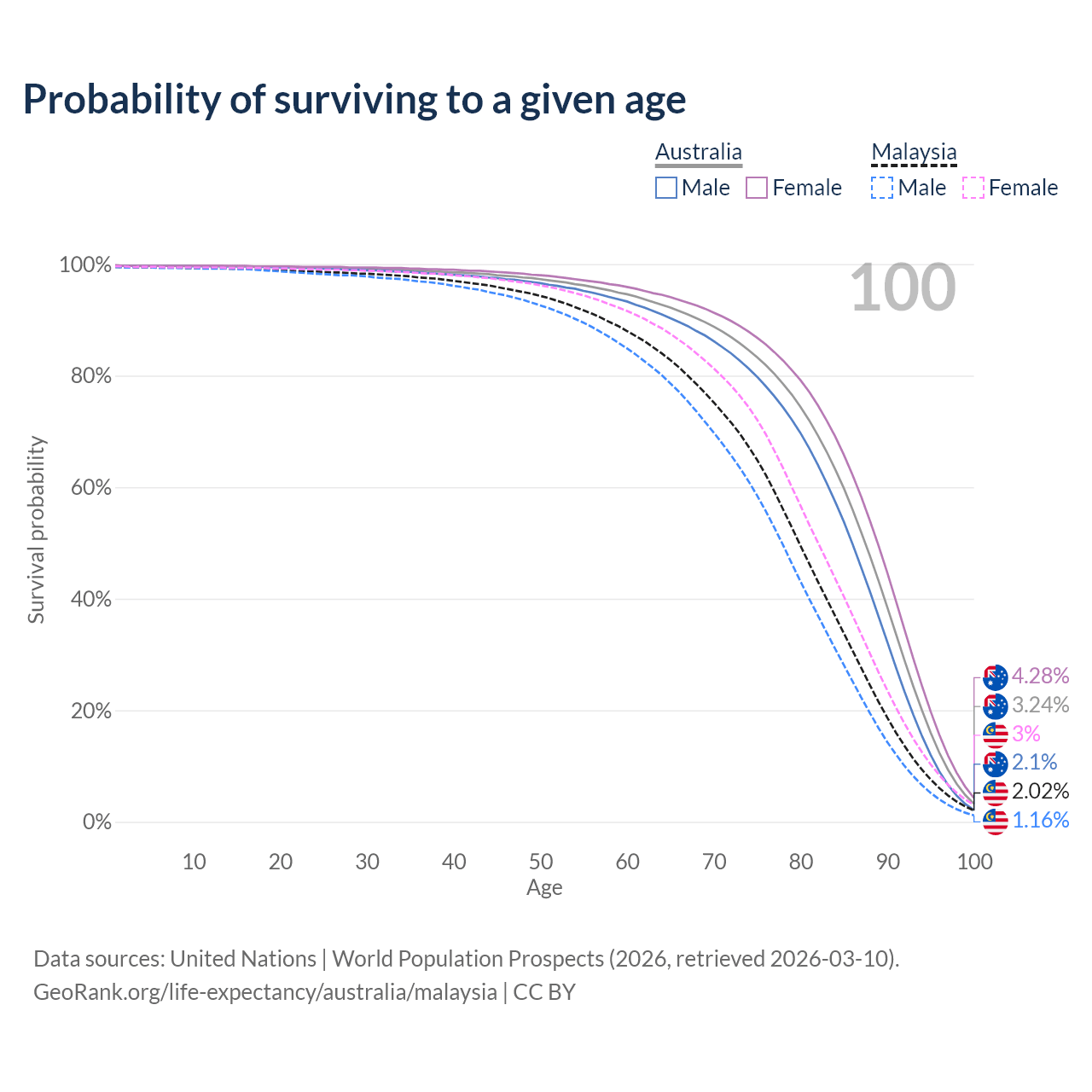 This life expectancy calculator shows the odds of living to 100, 95, 90, and below based on current age for both males and females in Australia and Malaysia, along with mean and median age of death. The calculations are based on the 2026 life tables (actuarial tables) from the UN World Population Prospects.