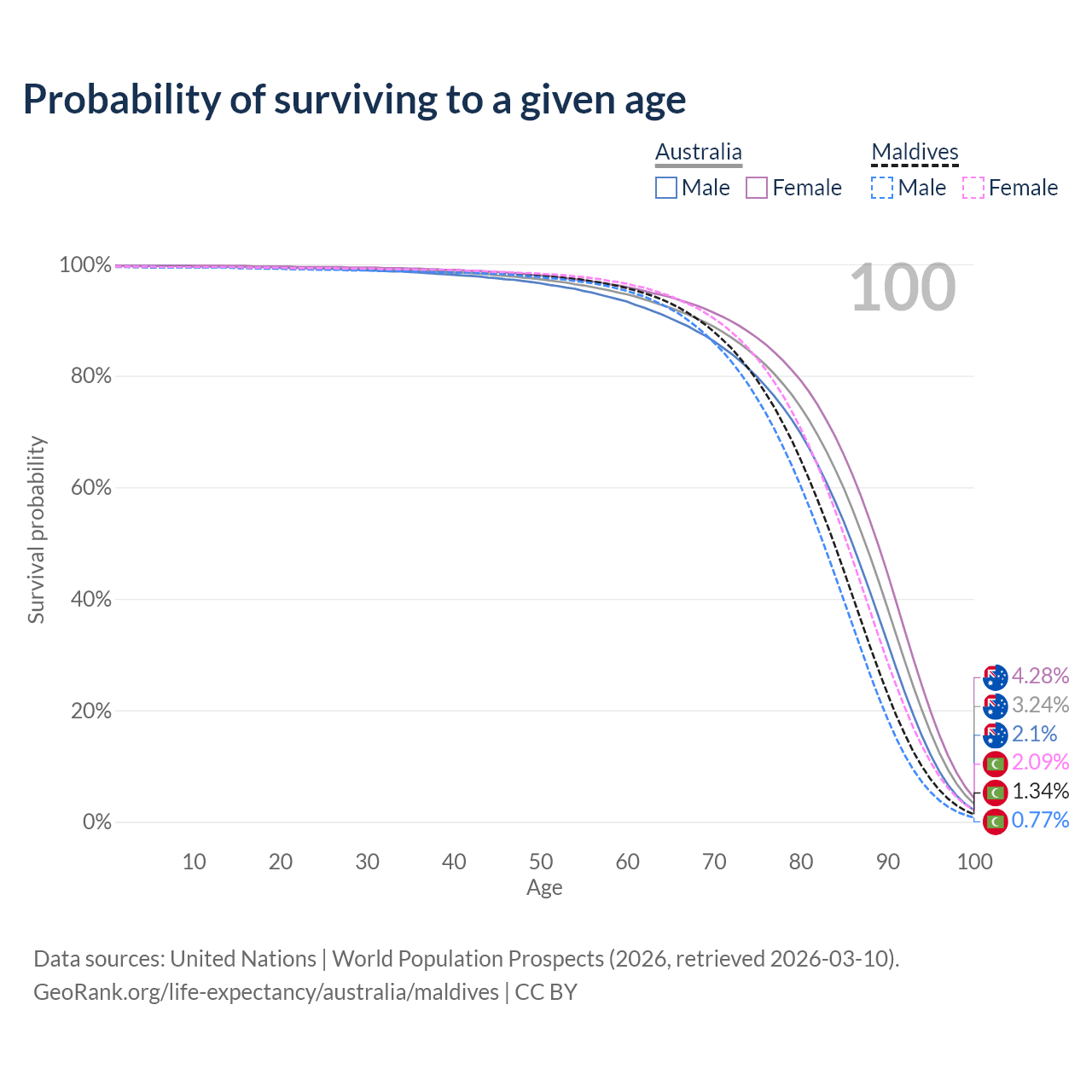 This life expectancy calculator shows the odds of living to 100, 95, 90, and below based on current age for both males and females in Australia and Maldives, along with mean and median age of death. The calculations are based on the 2026 life tables (actuarial tables) from the UN World Population Prospects.