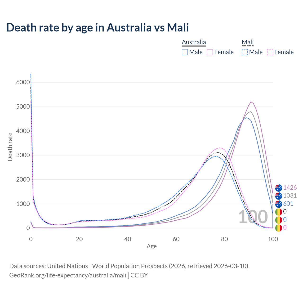In Australia, the most common age of death is 91, compared to 0 in Mali. The median age of death is 87.5 in Australia and 70.2 in Mali, meaning only half of each cohort is expected to live past that age.