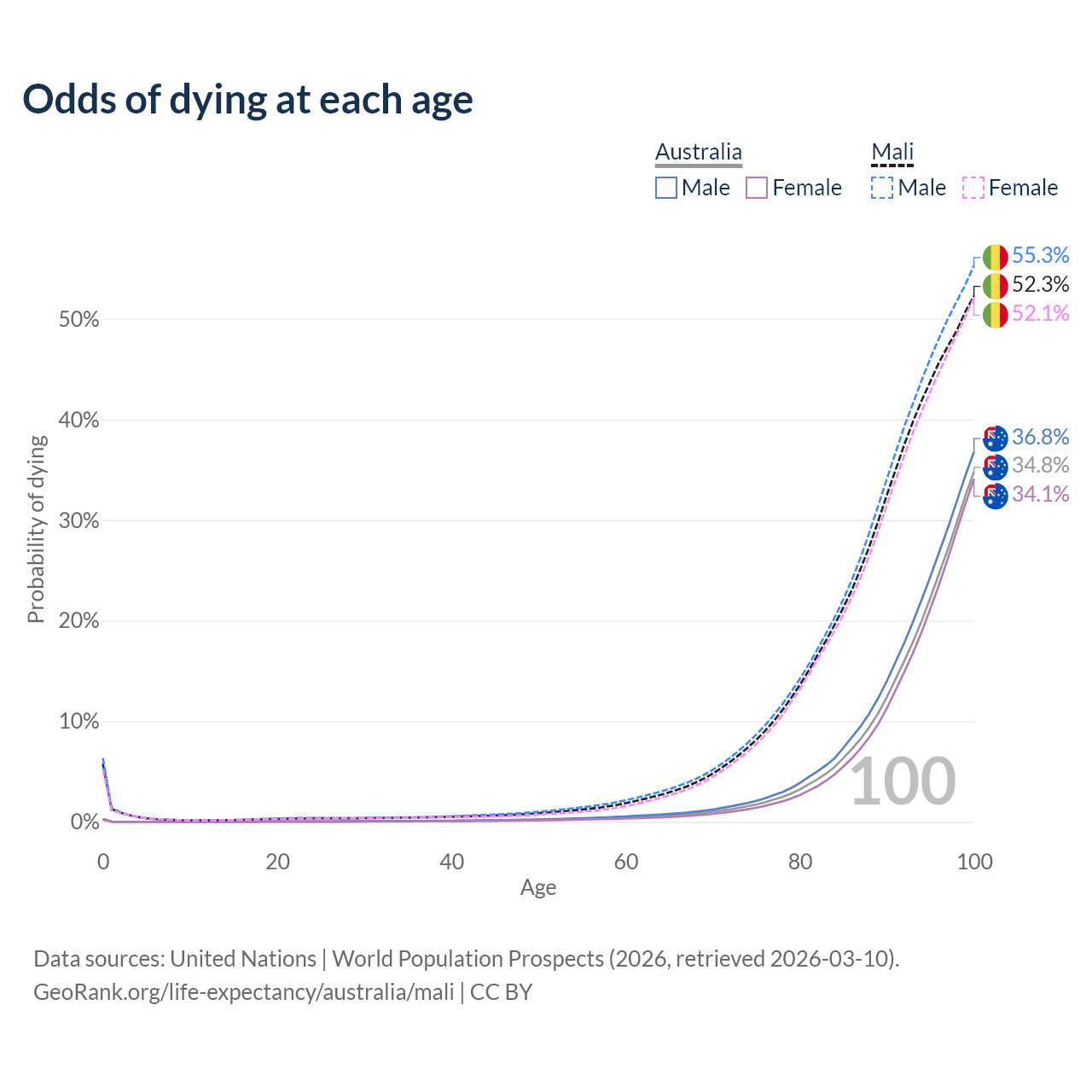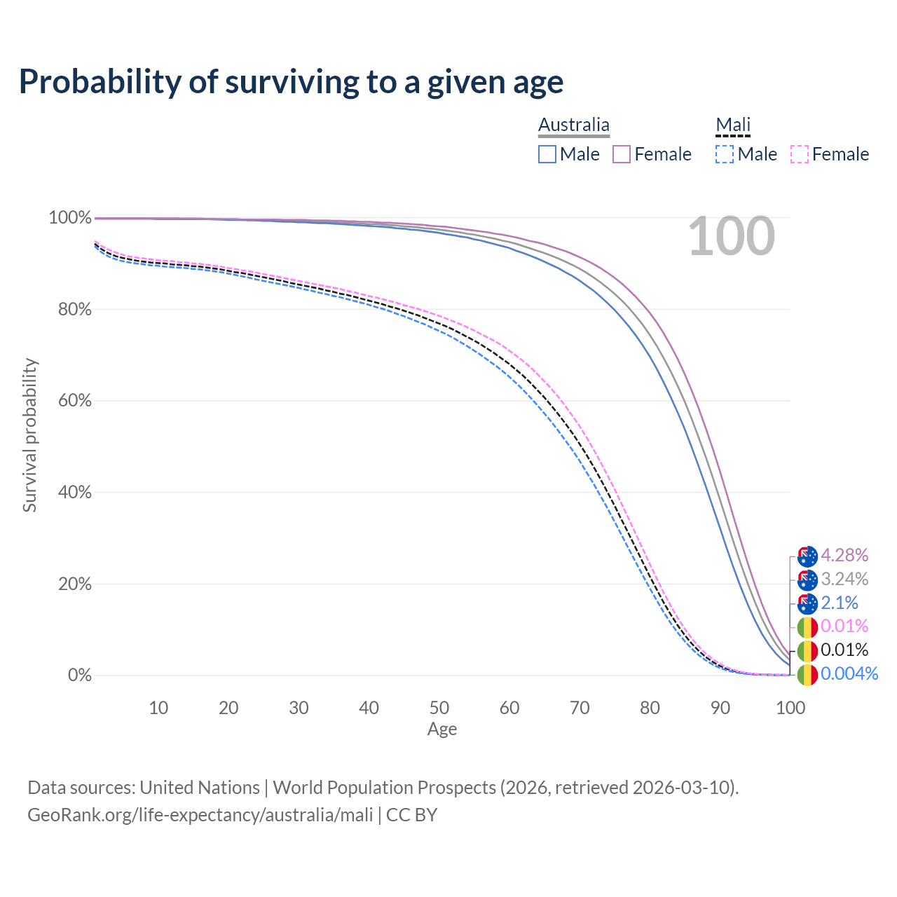 This life expectancy calculator shows the odds of living to 100, 95, 90, and below based on current age for both males and females in Australia and Mali, along with mean and median age of death. The calculations are based on the 2026 life tables (actuarial tables) from the UN World Population Prospects.