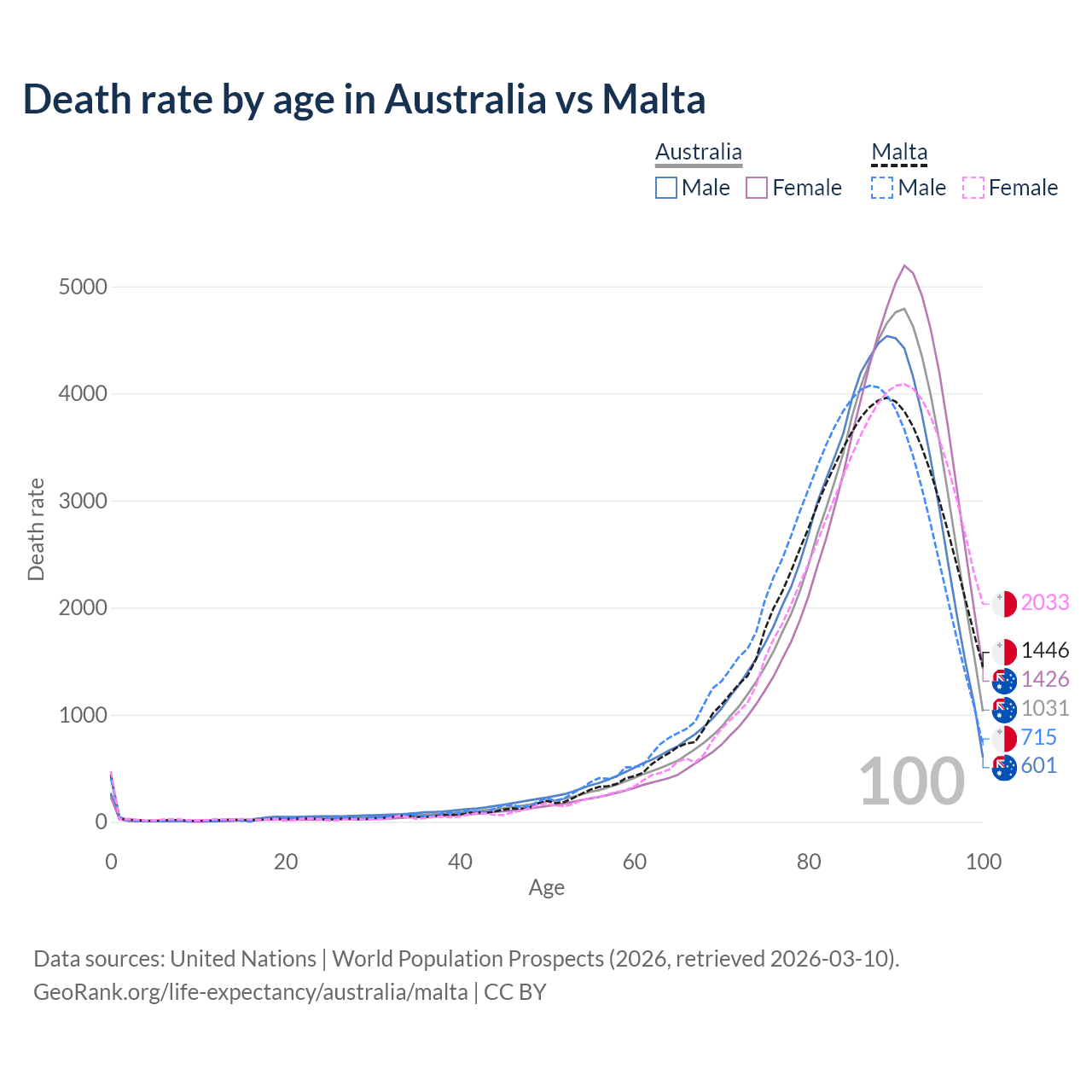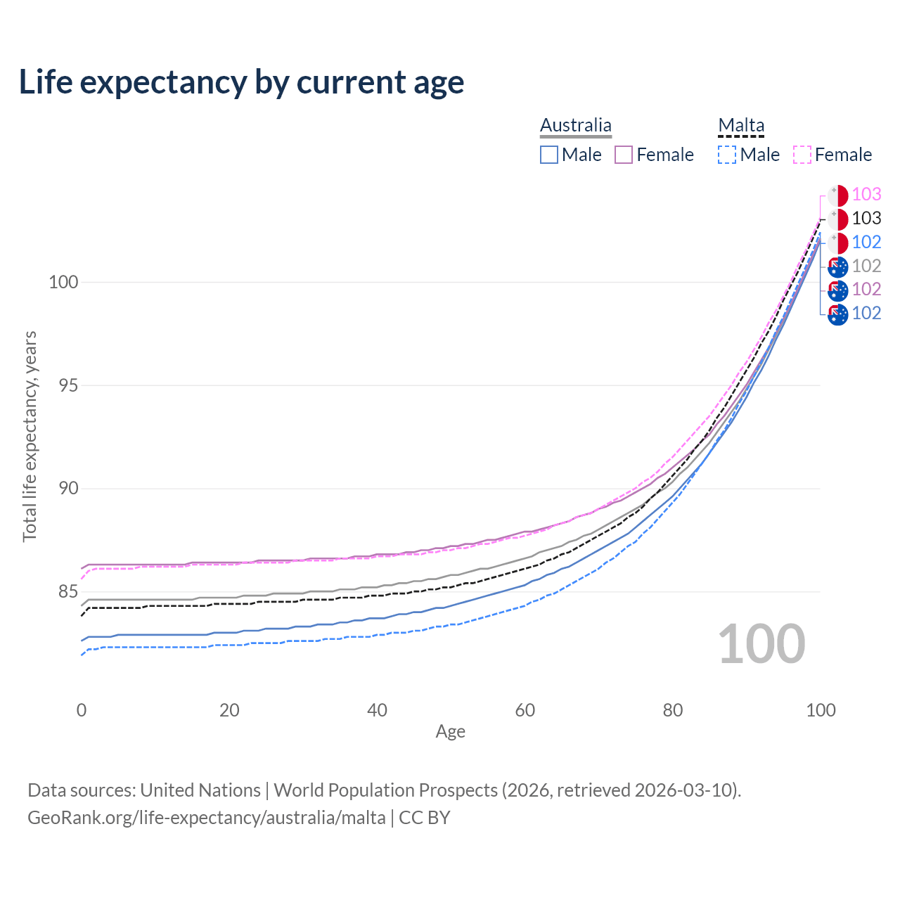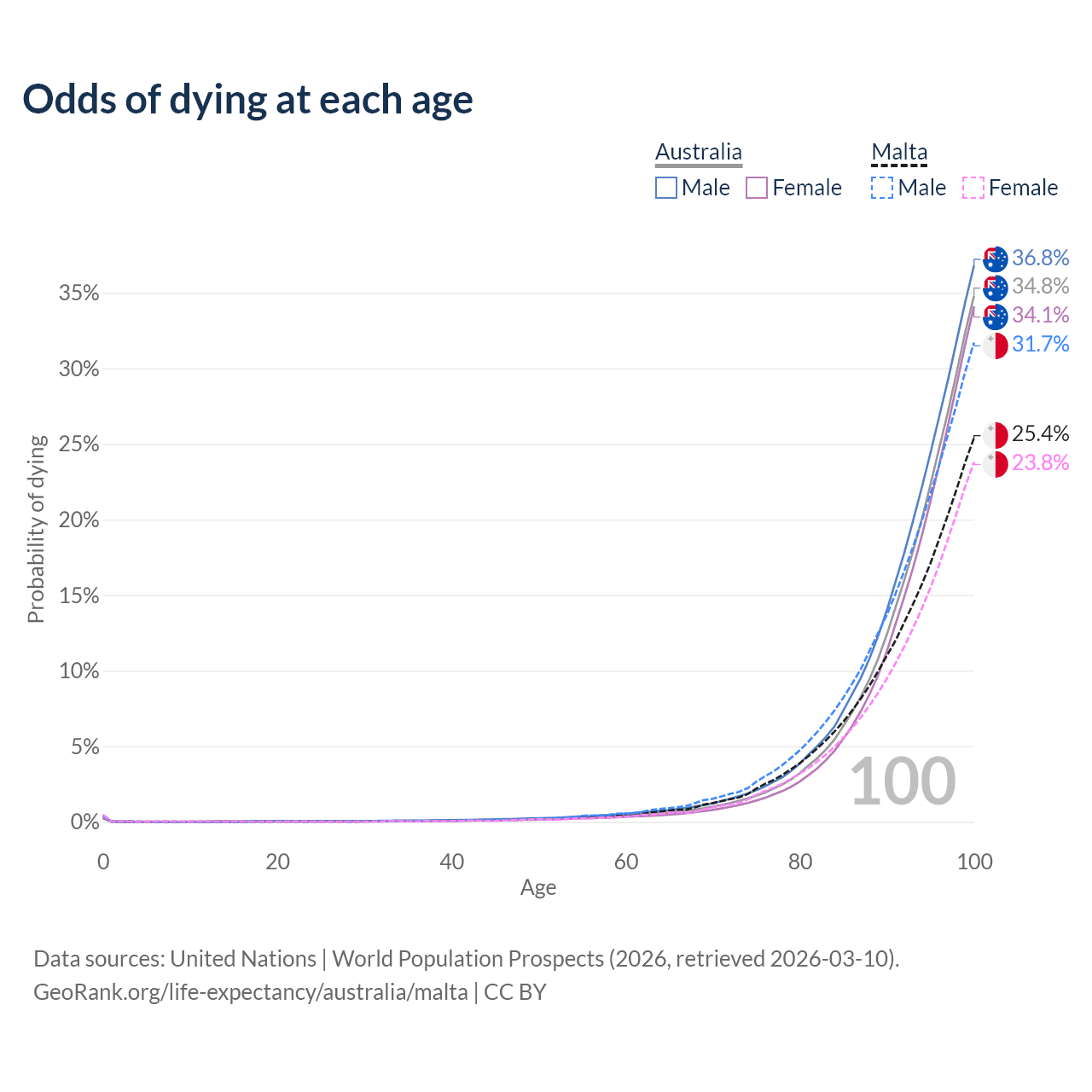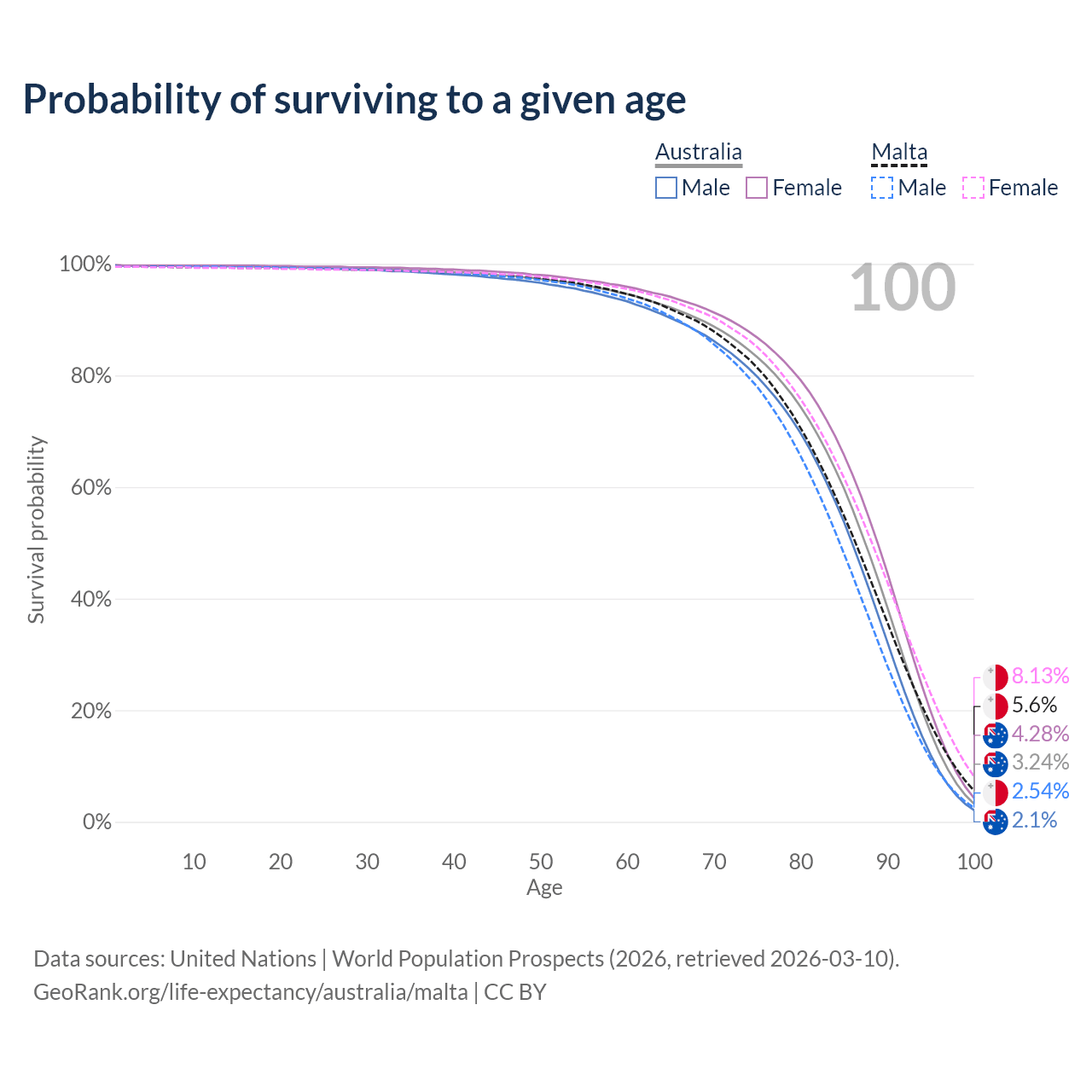 This life expectancy calculator shows the odds of living to 100, 95, 90, and below based on current age for both males and females in Australia and Malta, along with mean and median age of death. The calculations are based on the 2026 life tables (actuarial tables) from the UN World Population Prospects.