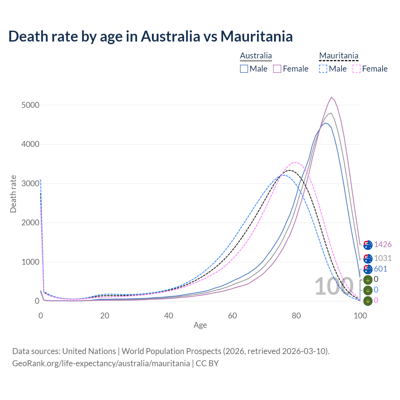 In Australia, the most common age of death is 91, compared to 78 in Mauritania. The median age of death is 87.5 in Australia and 74.1 in Mauritania, meaning only half of each cohort is expected to live past that age.